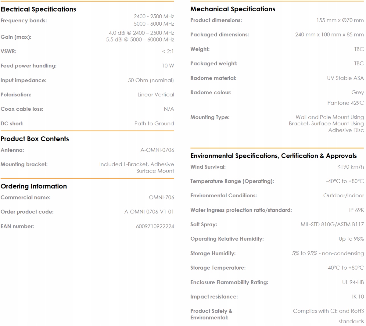 OMNI-706 — це дводіапазонна всеспрямована антена Wi-Fi, розроблена компанією Poynting. Діапазон дії антени охоплює діапазон Wi-Fi 2,4 ГГц і 5 ГГц, що забезпечує відмінне використання радіоспектру. Антена має максимальний коефіцієнт посилення 4 дБі на діапазоні 2,4 ГГц і 5,5 дБі на діапазоні 5 ГГц, що забезпечує кращу продуктивність для надійного з’єднання. Антена розроблена з чудовим контролем діаграми спрямованості у всьому діапазоні частот, що робить OMNI-706 винятковою спрямованою антеною для свого розміру. Антену OMNI-706 можна підключити до будь-якої точки доступу Wi-Fi, будь то стара технологія Wi-Fi або нова дводіапазонна технологія Wi-Fi. Таким чином, антену можна використовувати для вирішення проблеми насичення каналу та забезпечення найвищої продуктивності та гнучкості Wi-Fi. Це означає, що антену також можна використовувати для з’єднань «точка-точка», де є багато радіочастотних шумів і т.зв. захаращене оточення. Міцна конструкція корпусу забезпечує захист у несприятливих умовах навколишнього середовища з класом захисту IP 69K і IK 10. Антена має гніздо N-типу в основі, яке можна підключити до кабелю потрібного типу та довжини.