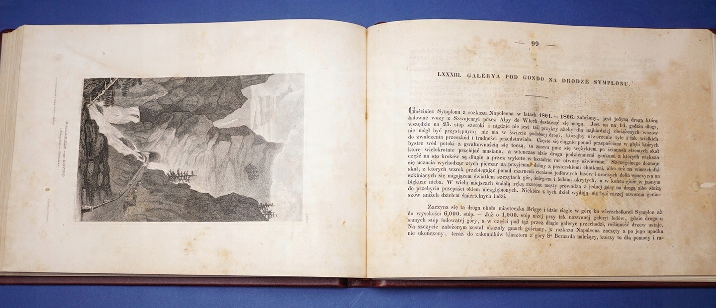 Колекція з 40 гравюр з описами польською мовою, які представляють найкрасивіші та найвизначніші місця світу. Формат картки 24,5 х 17, розміри гравюр на сталі приблизно 14-15 х 9-10 см. Деякі картки змінили колір через вік. Шкіряна палітурка з позолотою на корінці.