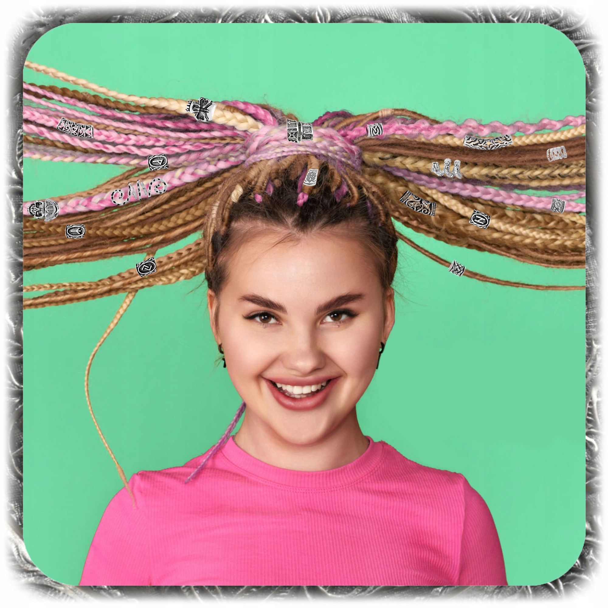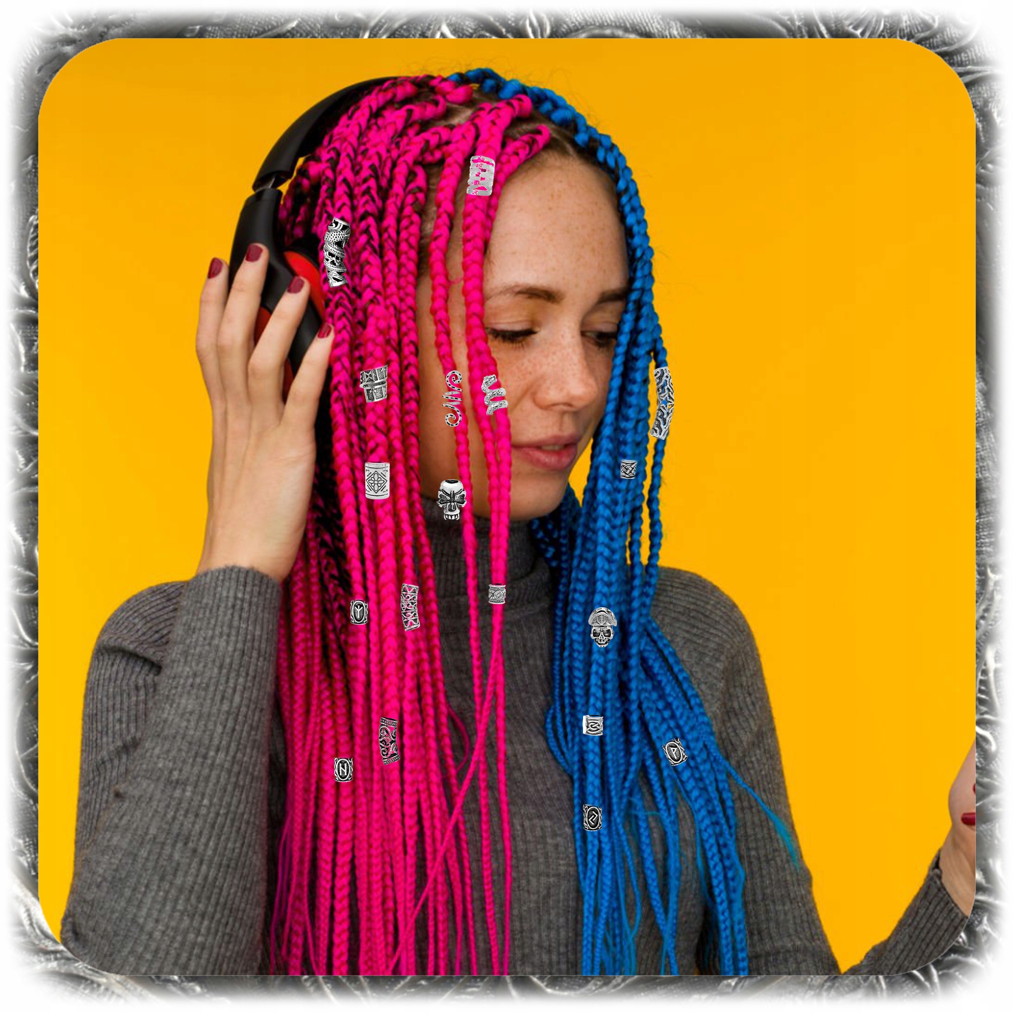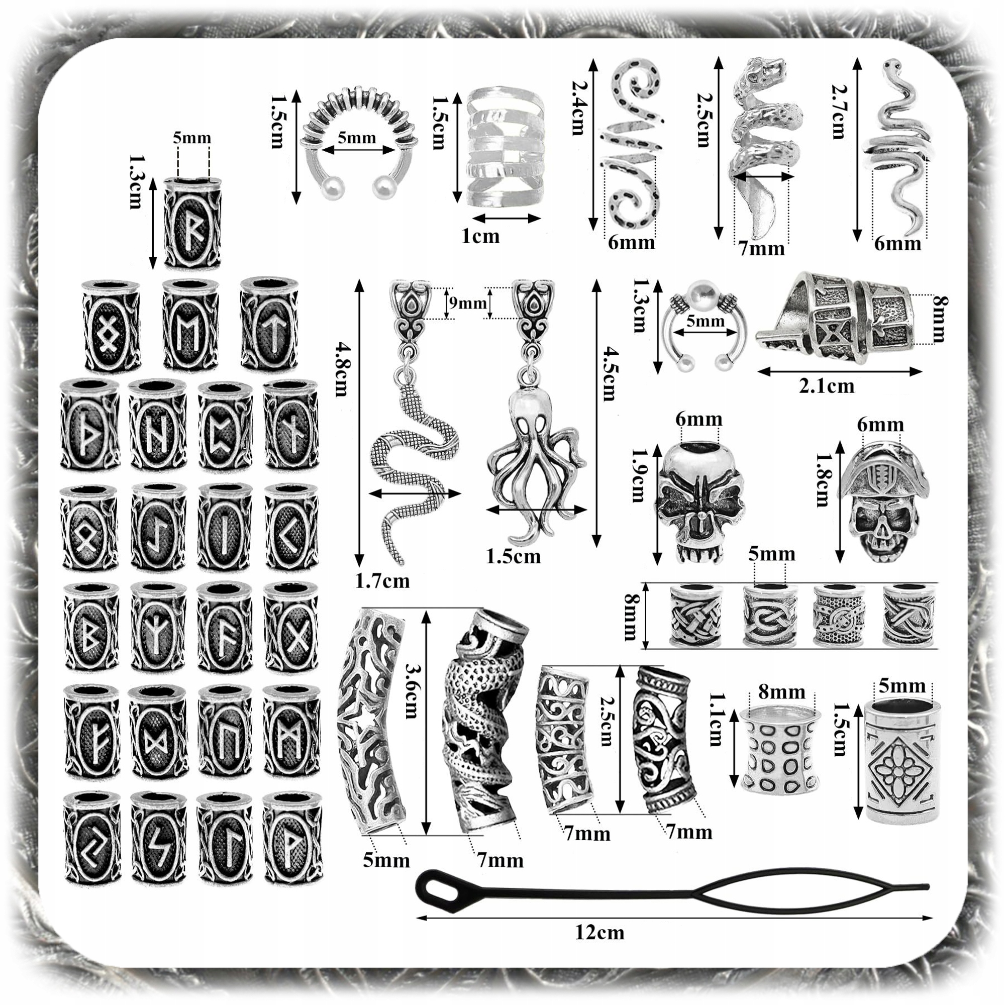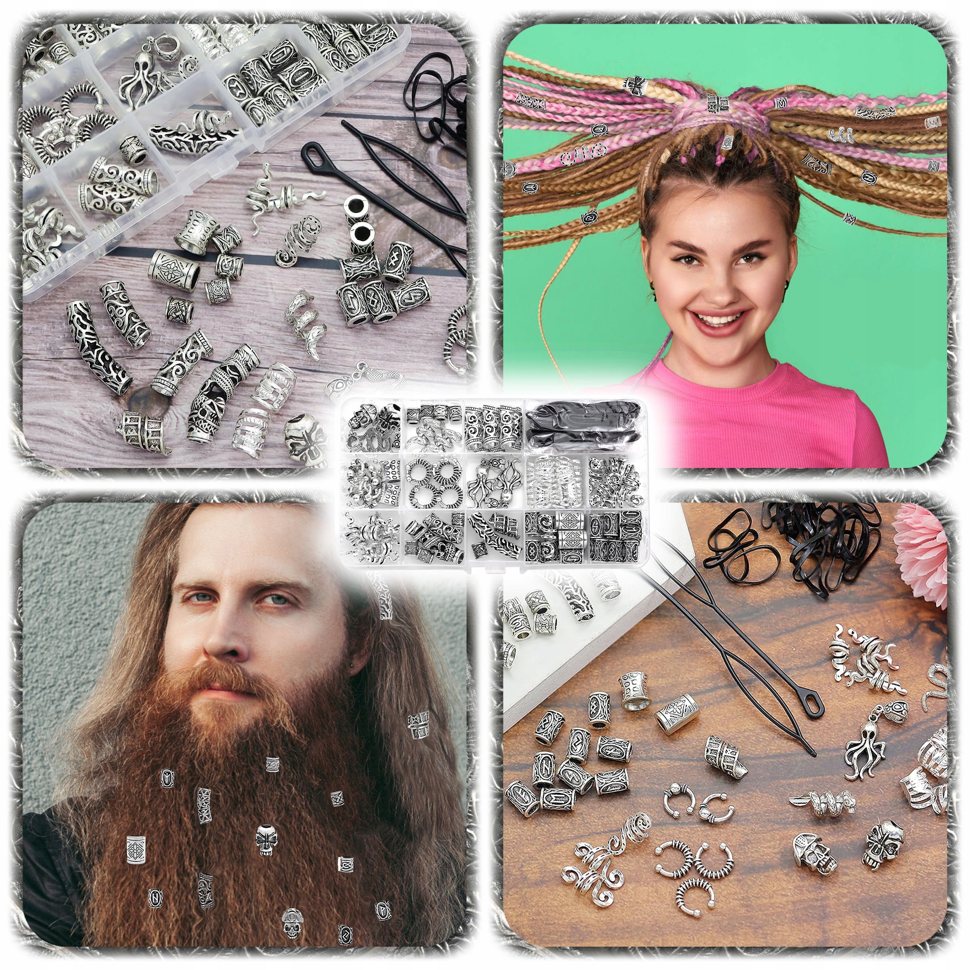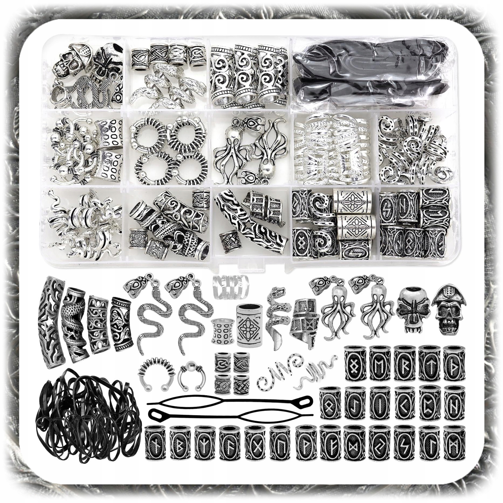 Дайте своїй зачісці або підборідді неповторний, хижачий стиль, натхненний північною культурою! Цей широкий набір є ідеальним рішенням для людей, які хочуть висловити себе через унікальні добавки для волосся. Він містить аж 160 елементів, , включаючи металеві намистини з унікальними візерунками, 50 гумаків для фіксації та зручного корпусу для зберігання.