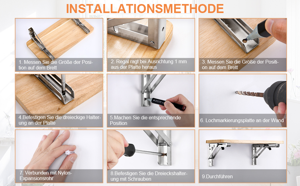 ?? ?? простий у встановленні? Їх дуже легко зібрати і складати, щоб ви могли створити складну кронштейн полиці або невеликий складний настінний стіл для будинку або гаража. Його можна встановити на будь -якому типі стіни без пошкоджень. Містить 6 високоякісних гвинтів з нержавіючої сталі та 6 труб розширення.