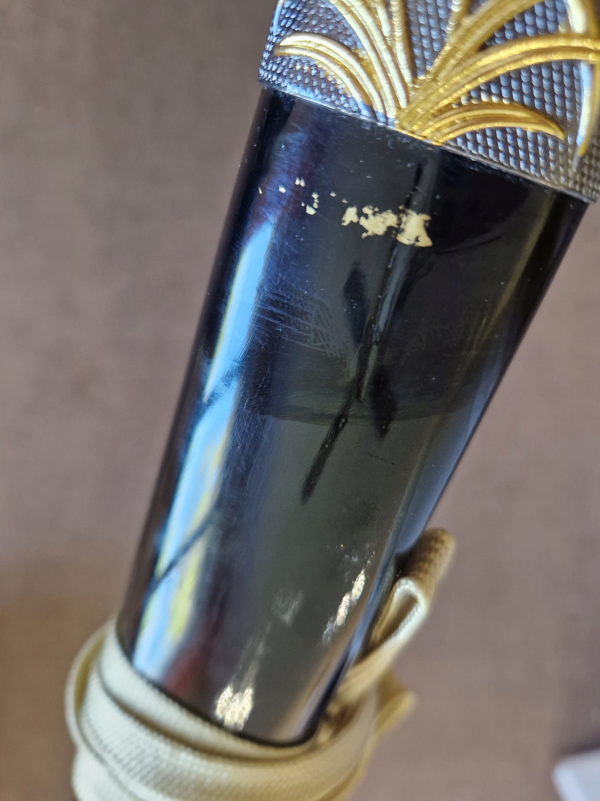 - лезо : вуглецева сталь, відшліфована (вимагає технічного обслуговування), прикрашена броня на лезі, хімічно отримана, гравірування в ручці. Чорна бавовна, імітація шкіри променів, металева цуба.