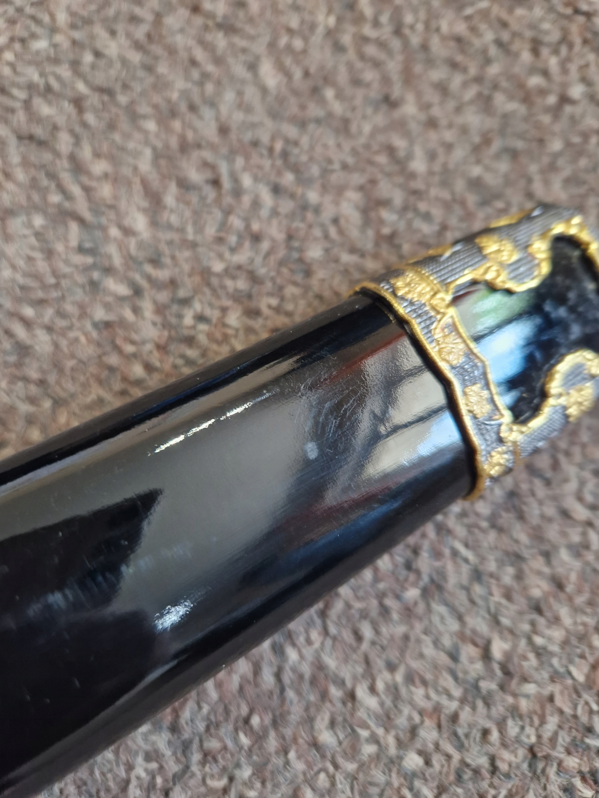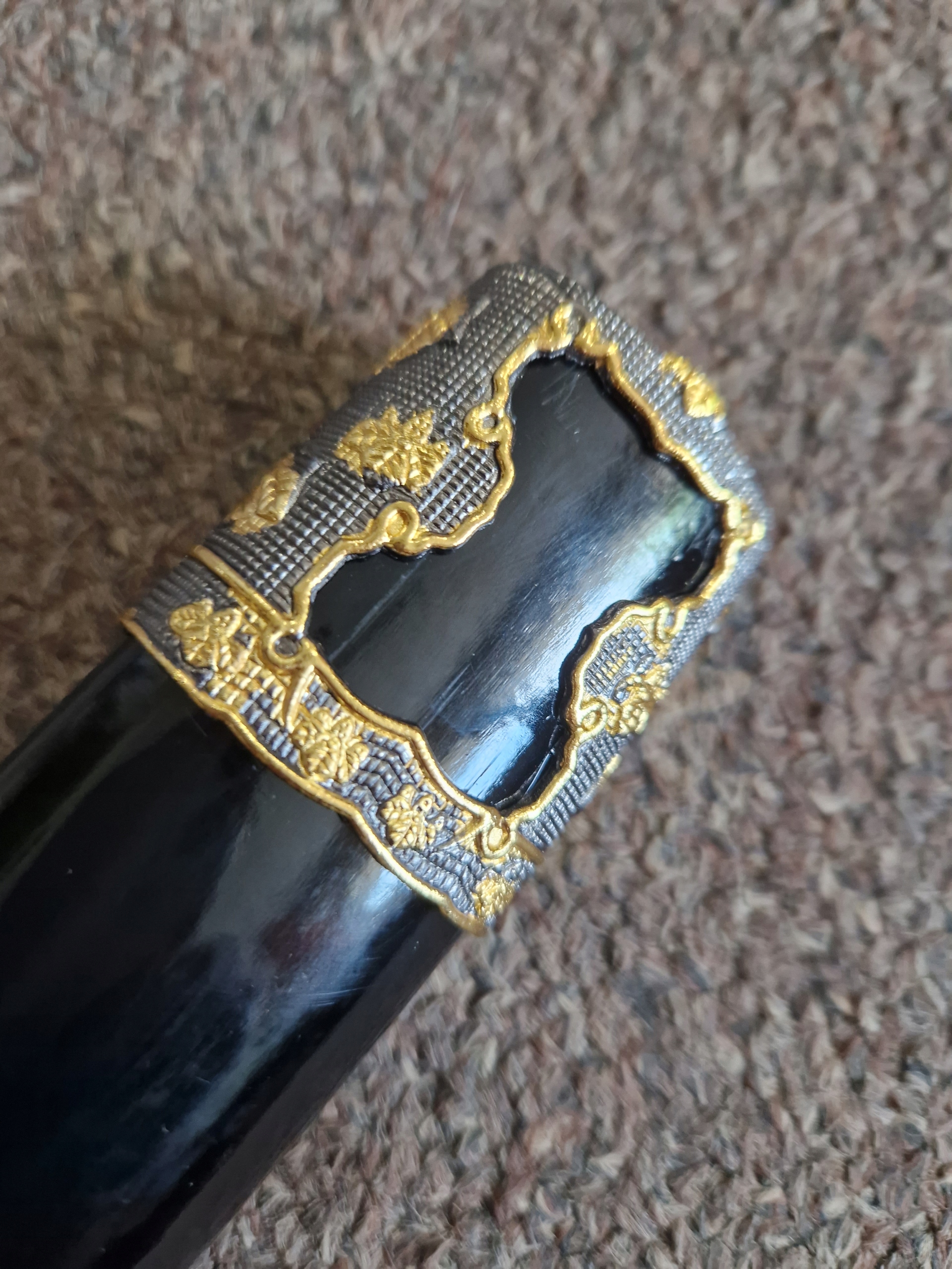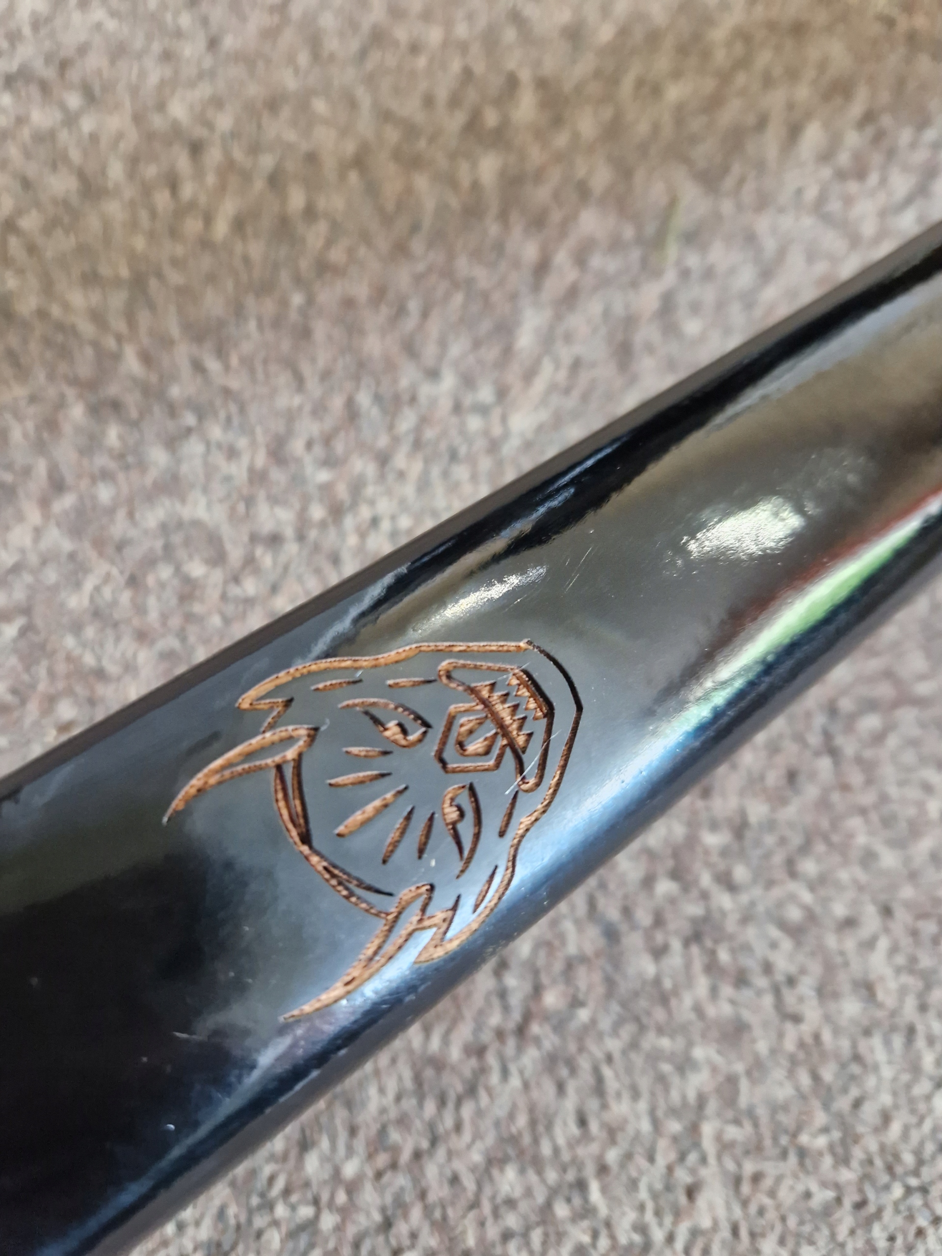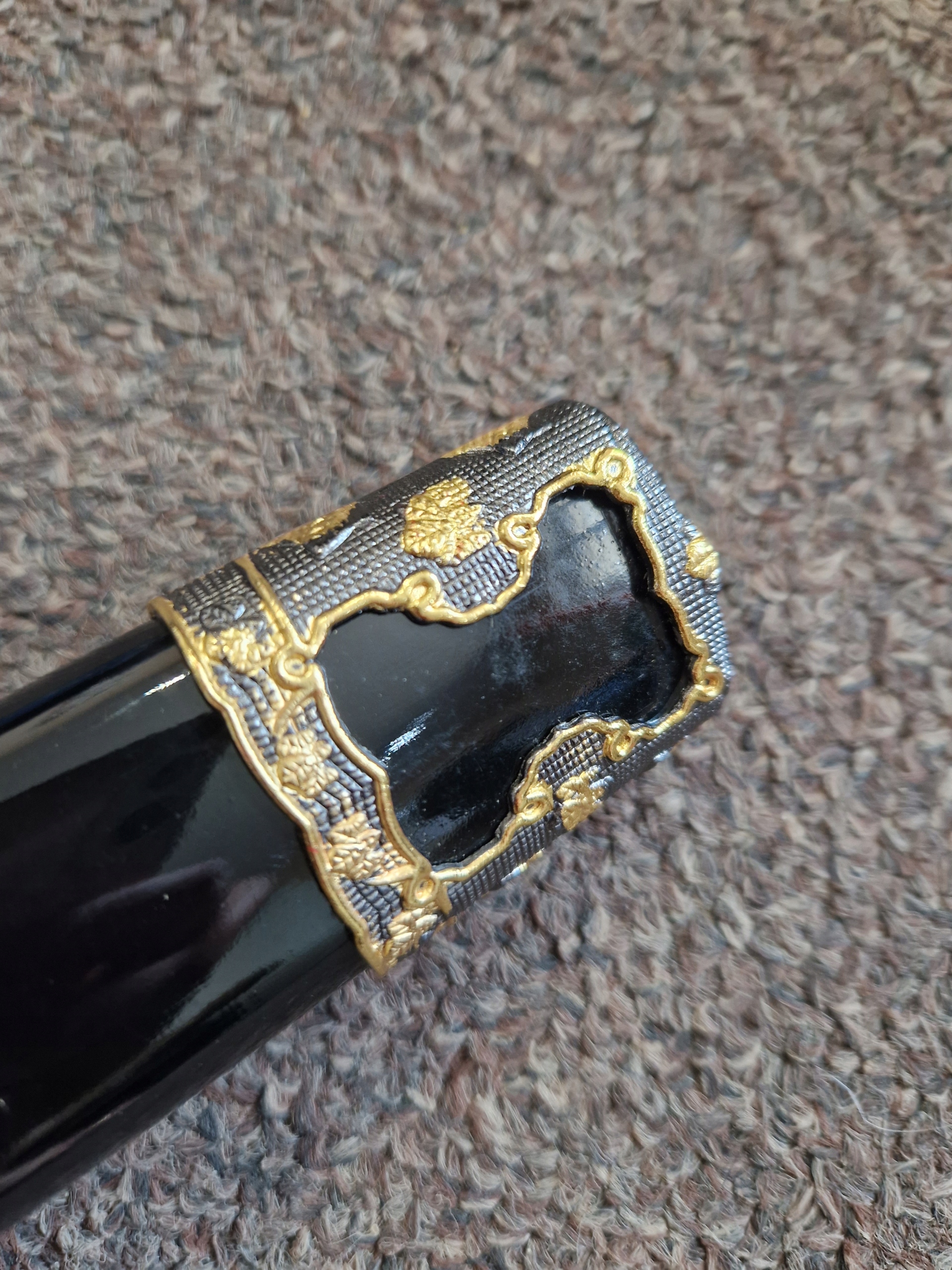 - лезо : вуглецева сталь, відшліфована (вимагає технічного обслуговування), прикрашена броня на лезі, хімічно отримана, гравірування в ручці. Чорна бавовна, імітація шкіри променів, металева цуба.