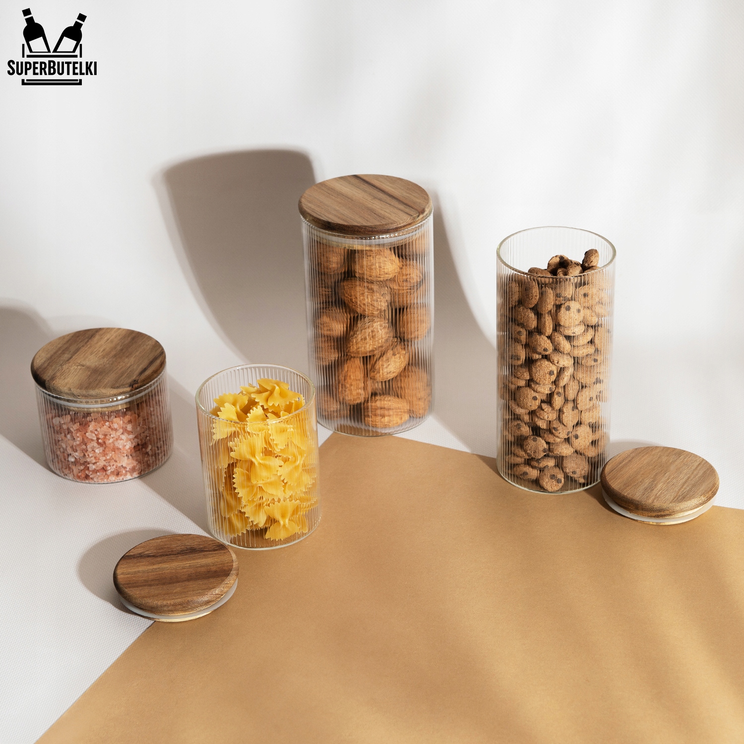 Вертикальні канавки на склі додають унікальний стиль контейнерам, завдяки якому вони добре поєднуються в сучасних, скандинавських та мінімалістичних інтер'єрах. Їх вишуканий зовнішній вигляд та дерев’яне закриття також ідеально у ванній кімнаті - для зберігання бавовняних прокладок, солей для ванни, косметичних паличок або інших невеликих аксесуарів.