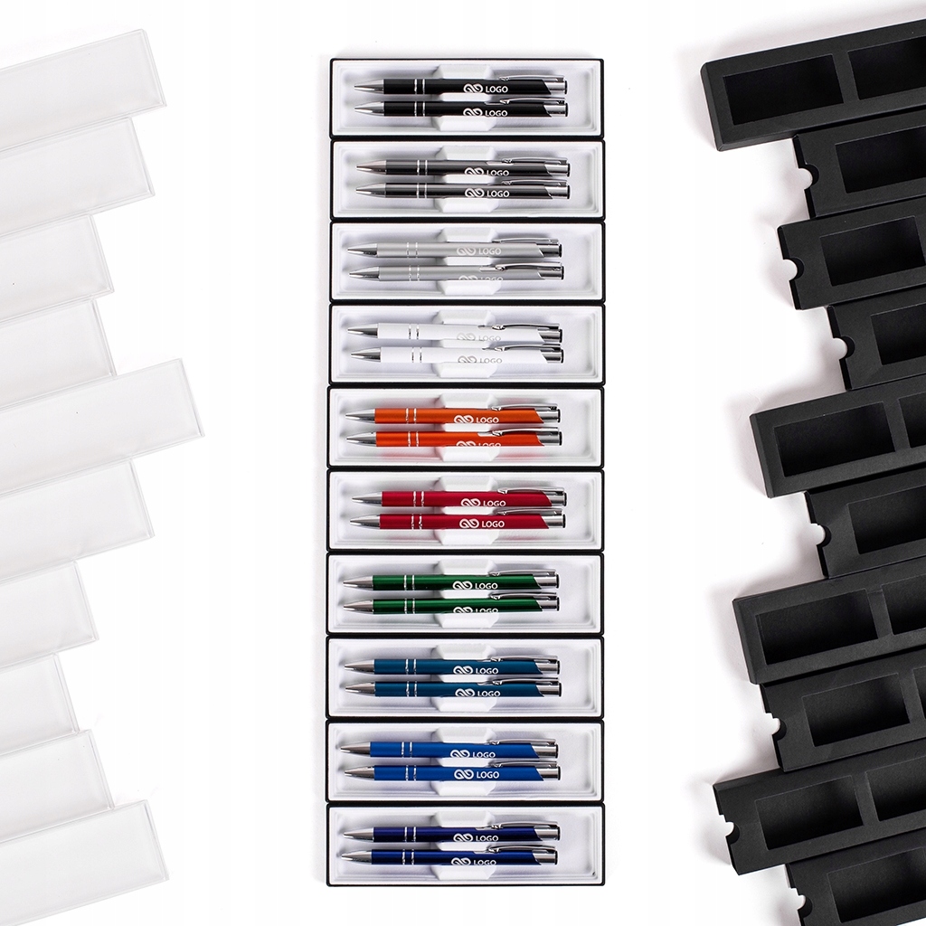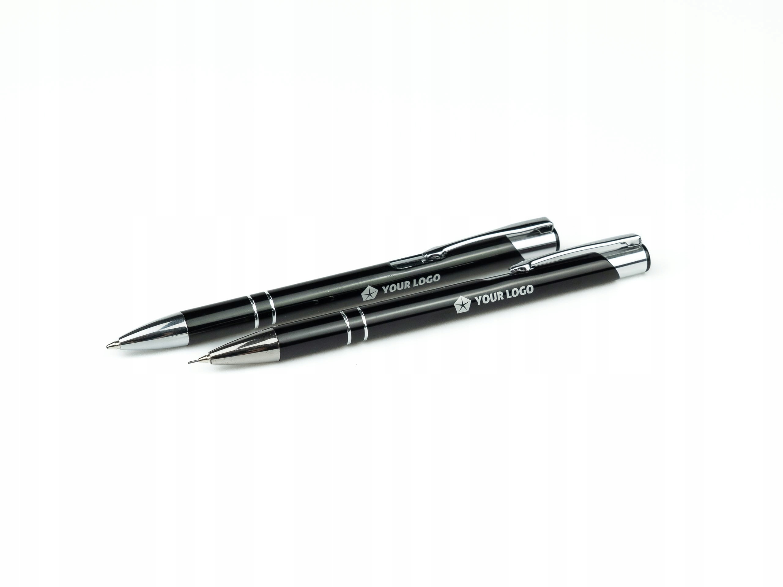 Ідеальний стаціонарний набір, ідеально підходить для елегантного рекламного гаджета. Ручка виготовлена з алюмінію, покритого високоякісним лаку, колір якого вибирає замовника. Він має замінну синю вставку, розблоковану натисканням кнопки ніжної кнопки. Корпус олівця виглядає так само, внесок якого замінюється графітовими стилями. На обох об'єктах, рекламний друк, гравірований лазер. Набір упакований в елегантну коробку розміром 17,5 х 5,2 х 2,5 сантиметри.
