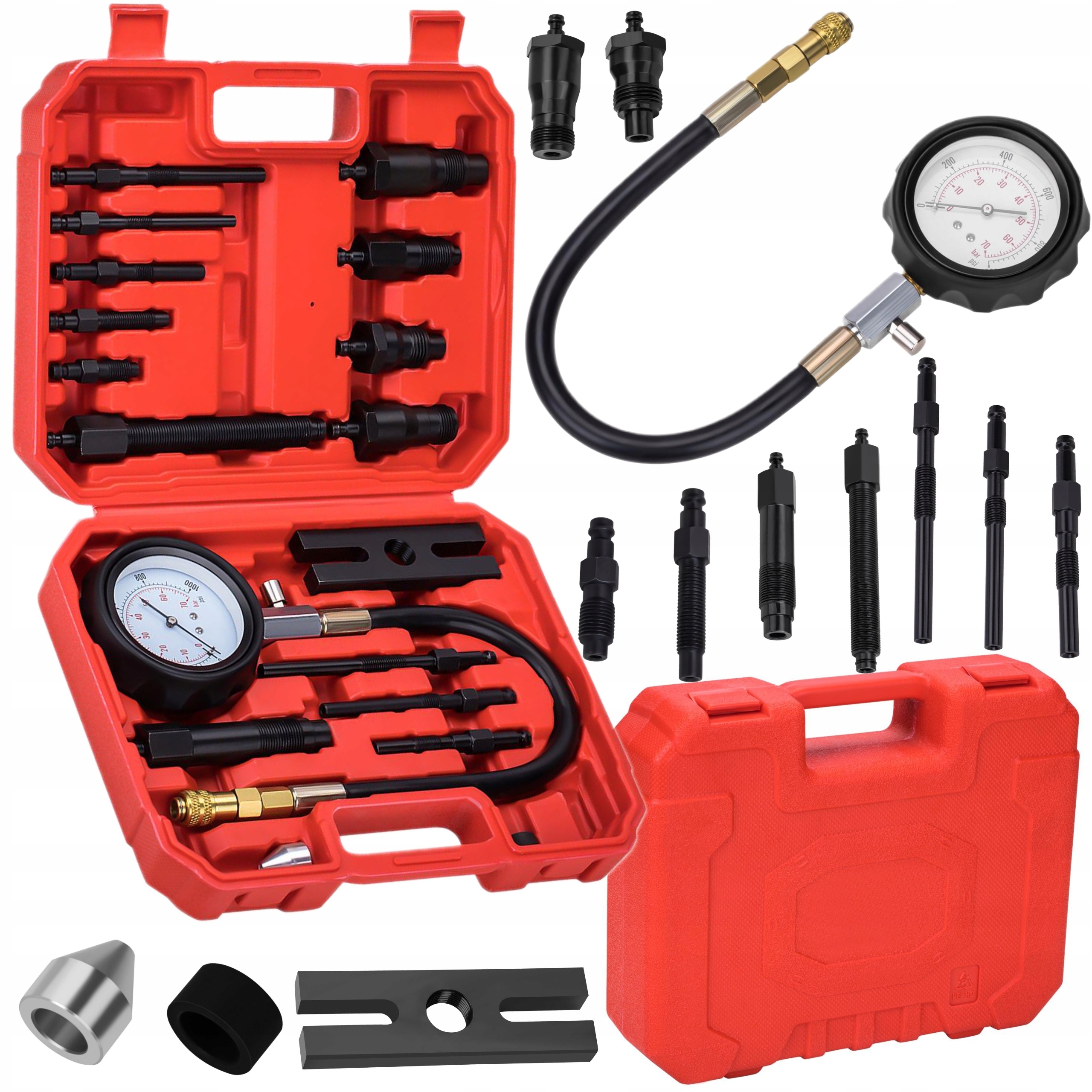 Збірник призначений для вимірювання тиску стиснення в дизельних двигунах (дизель). The set includes a pressure meter of up to 70 bar (1000 psi) with a cable, quick coupling and release valve, 4 adapters mounted at the injector's place, 9 adapters mounted at the glow plug, one universal adapter and type H attachment, thanks to which it matches most car brands: BMW, Citroen, Fiat, Ford, Isuzu, Land Rover, Mazda, Mazda Mercedes, Mitsubishi, Nissan, Opel, Peugeot, Renault, Rover, Seat, Toyota, Volkswagen.