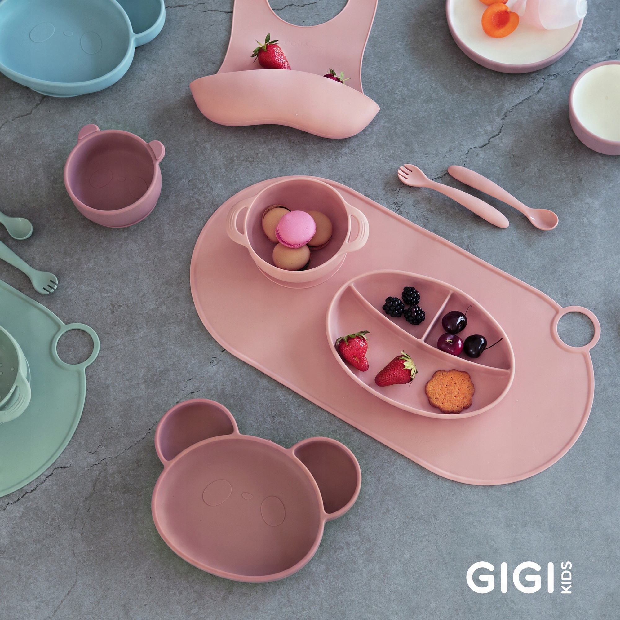 5-елементний набір силіконових судин + столові прилади з нержавіючої сталі, рожевий порошок: