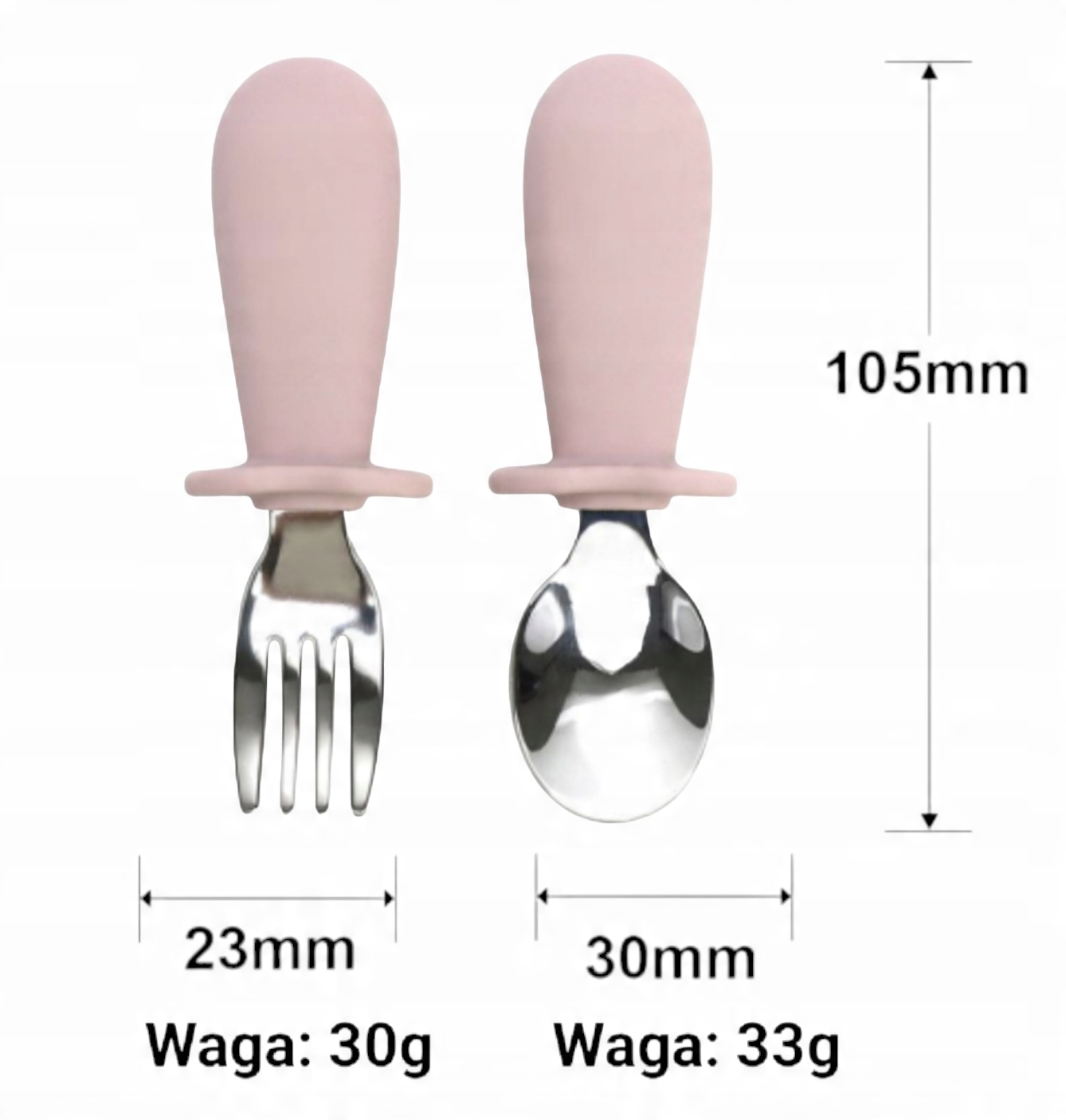 - столові прилади з нержавіючої сталі з продуктовою силіконовою ручкою, без BPA, фталатів, пластикових та важких металів. Розробити здатність використовувати руку в координації ручної книги.