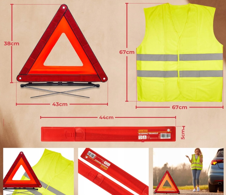 4 Попереджувальний трикутник та світловідбиваючий жилет збільшують вашу видимість та безпеку у разі невдачі або зупинки на дорозі. 4 Набір міцний і надійний у кожній дорожній ситуації.