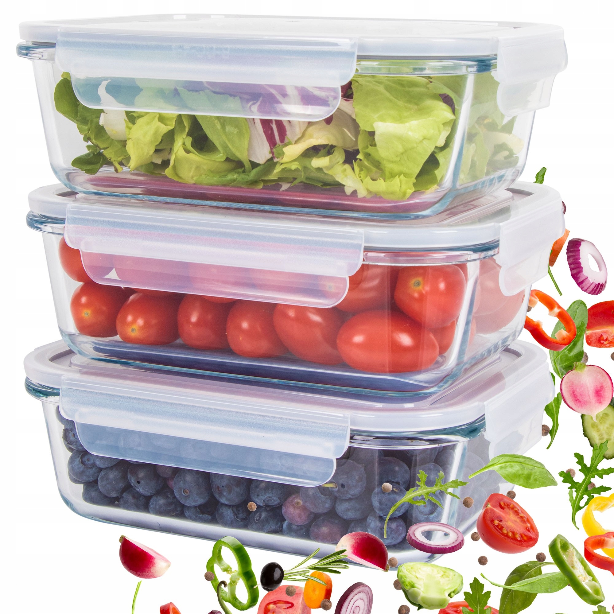Набір прозорих скляних контейнерів з герметичним закриттям для зберігання їжі. Набір був виготовлений повністю з високоякісного скла, стійкого до температури в діапазоні від -40 до +400 ° С. Таким чином, ми можемо зберігати їх у морозильній камері, а також нагрівати в них посуд за допомогою мікрохвильової печі.