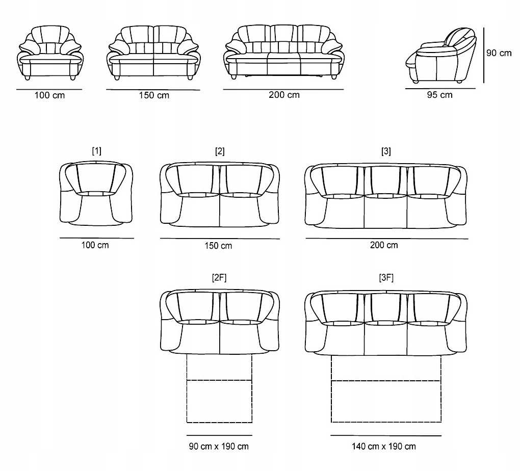 - Ширина: 3 -сорний диван, 200 см, диван 2 -особи, крісло 100 см