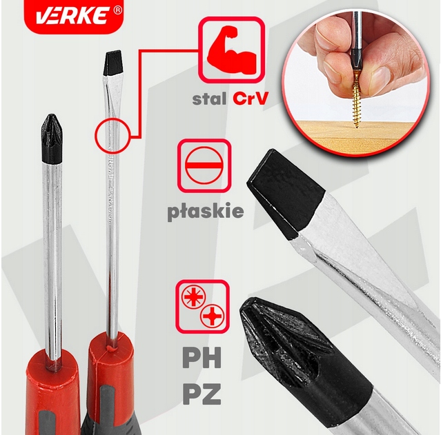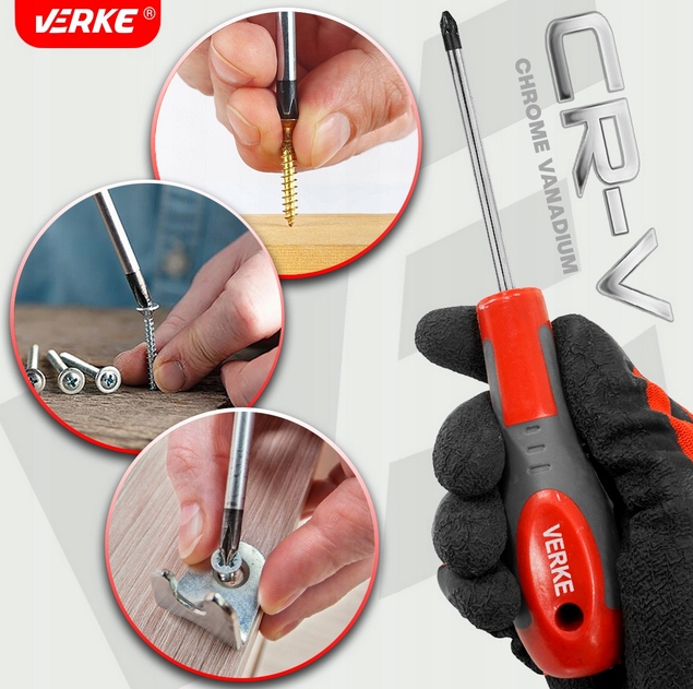 Набір викруток, виготовлених із сталі хрому-ванадію (CRV). Ергономічна ручка забезпечує певне зчеплення інструменту та гарантує ефективну та точну роботу. Набір складається з трьох плоских викруток і трьох поперечних філіпсів та двох Pozidriv. Розміри викруток були обрані таким чином, щоб вони відповідали гвинтам, що використовуються в кожному будинку та майстерні.