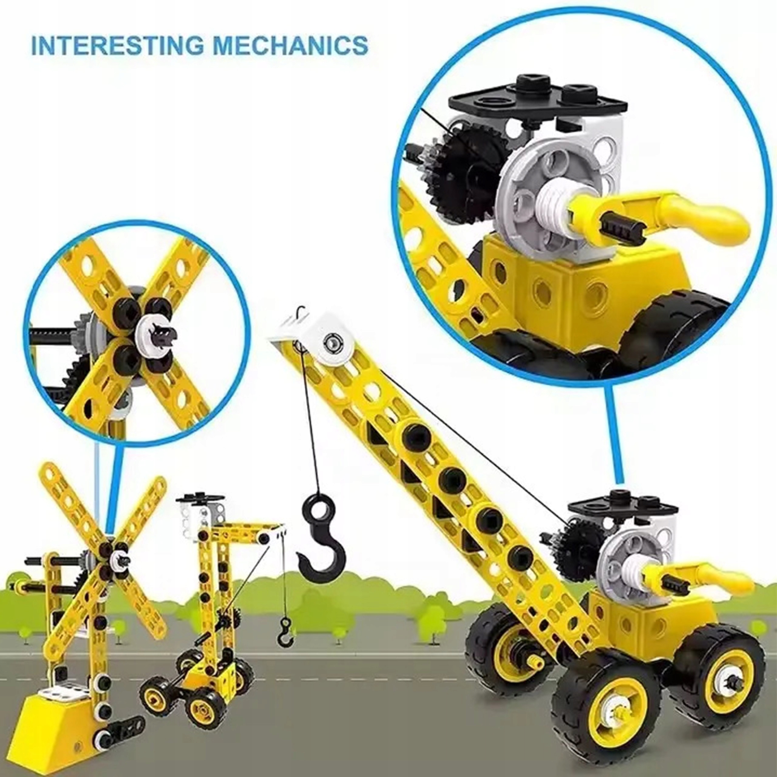 Набір будівельних транспортних засобів з бренду Woopie - це 100 елементів, з яких молодий конструктор може створити 8 різних моделей, таких як кран, вітряк, вантажівка та інше будівельні машини! Завдяки простому системі скручування та запуску, діти легко увійдуть у захоплюючий світ побудови, розвиваючи ручні навички, логічне мислення та просторову уяву. Це іграшка, яка вчить принципів машини та механізмів, і в той же час вводить інструменти та їх безпечне використання у світ.