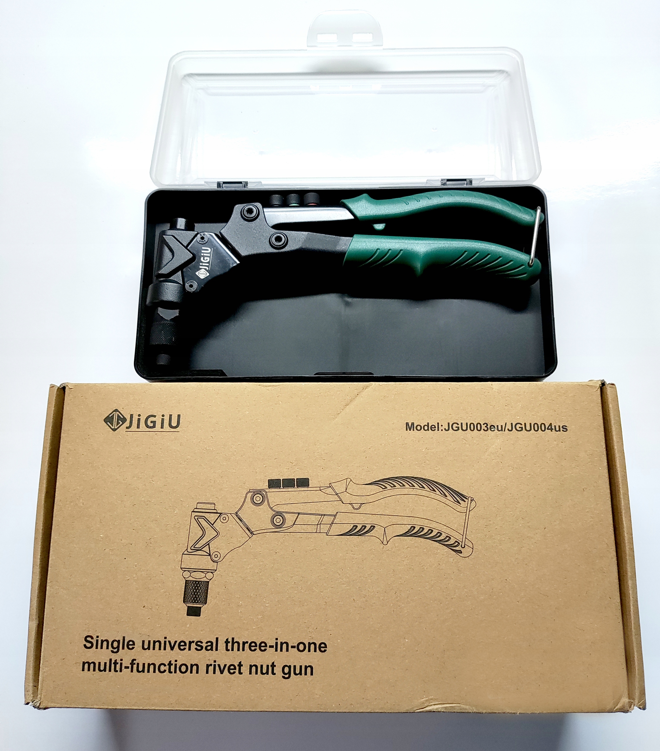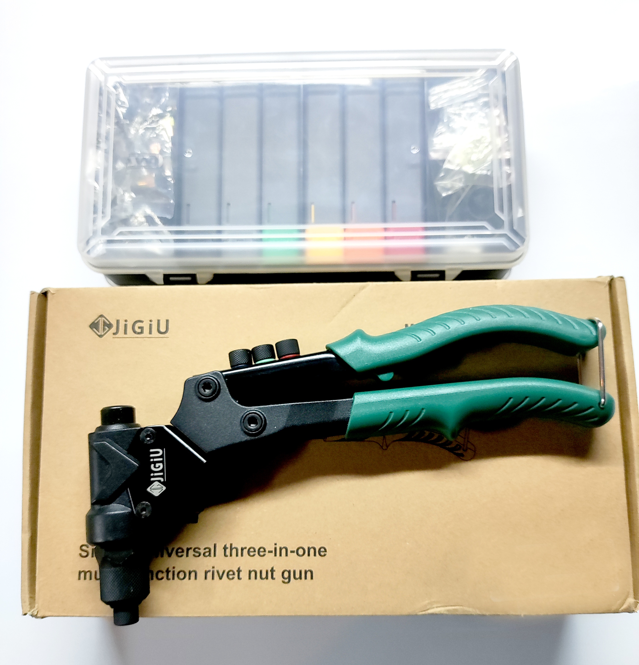 - Кілька аксесуарів: 4 змінні набори метричних шпильок/носів, 4 типи змінних заклепок, 2 брошки, гайки M3-M6, квадратні заклепки 2,4-4,8 і вигнуті брошки. Специфікації 80 шт. заклепкових гаек перераховані наступним чином: M3-10 шт., M4-10 шт., M5-10 шт., M6-10 шт.; 2,4-10 шт., 3,2-10 шт., 4,0-10 шт., 4,8-10 шт.