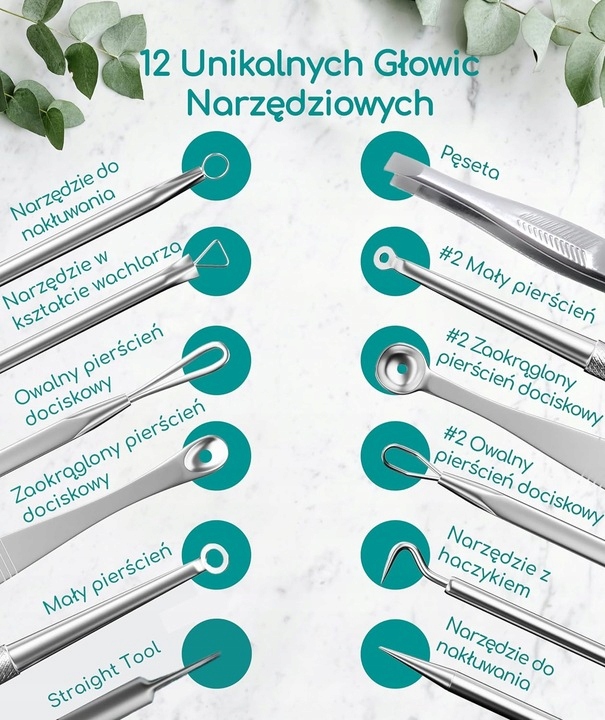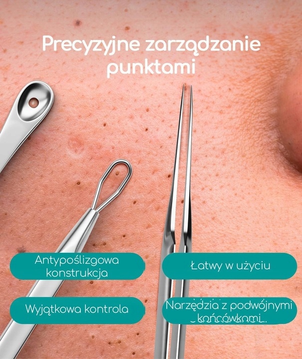 містить 7 пристроїв з нержавіючої сталі, кожен з подвійним закінченням та різними порадами . Він включає інструмент для видалення відкритих і закритих вугрів, гострих пінцетів, голки до прищів та інших. Використовуйте обережно та обережно.
