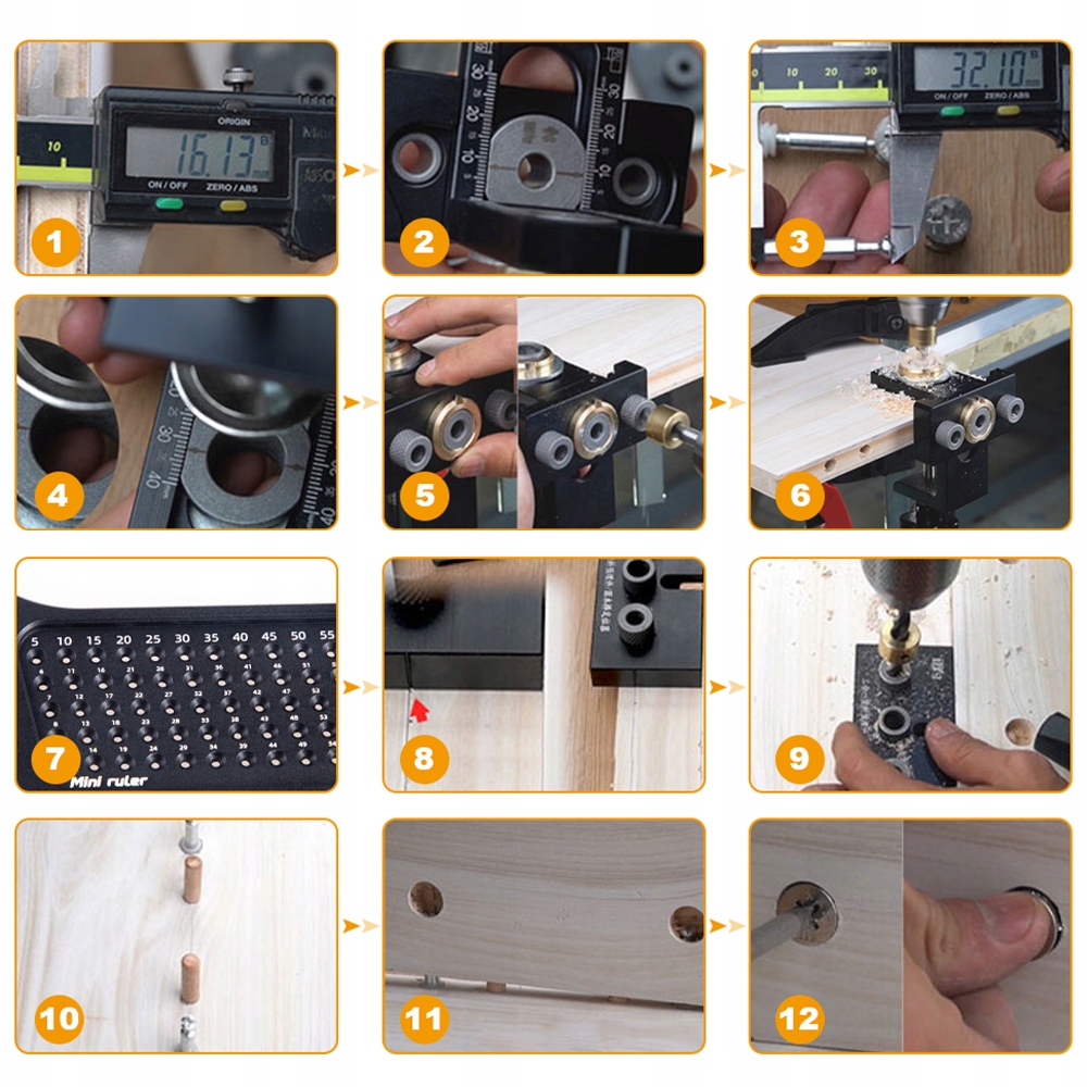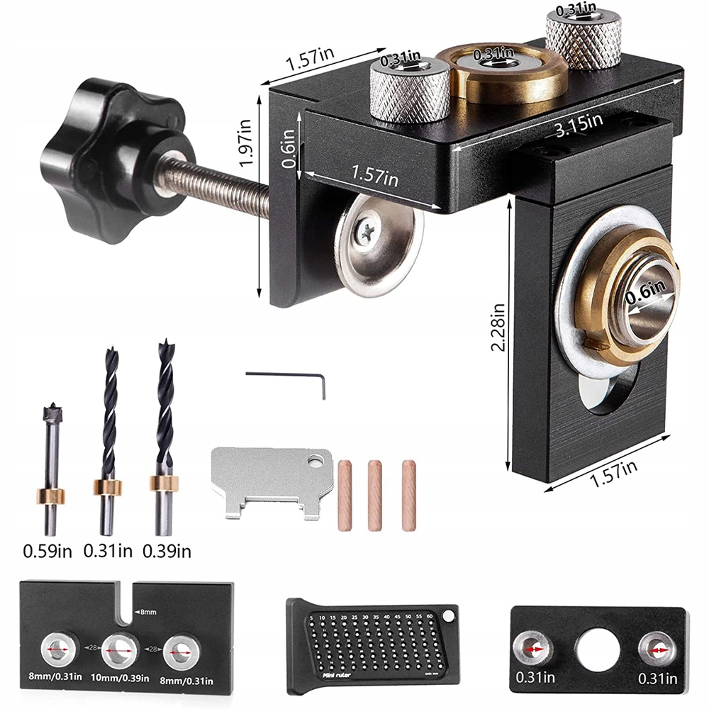 містить загартовані сталеві рукава в 3 розмірах (8 мм, 10 мм, 15 мм) для швидкого та точного буріння кутів, країв, з'єднань та різних з'єднань.