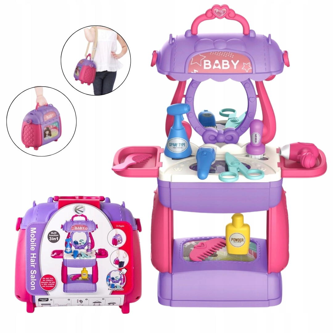косметика, сушарка та аксесуари для волосся - це ідея для великої забави кожної дівчинки. Набір включає різні типи туалетних приналежностей, ножиць, гребінця, всі упаковані в надзвичайно зручний багажник, який дитина може здійснити подорож.