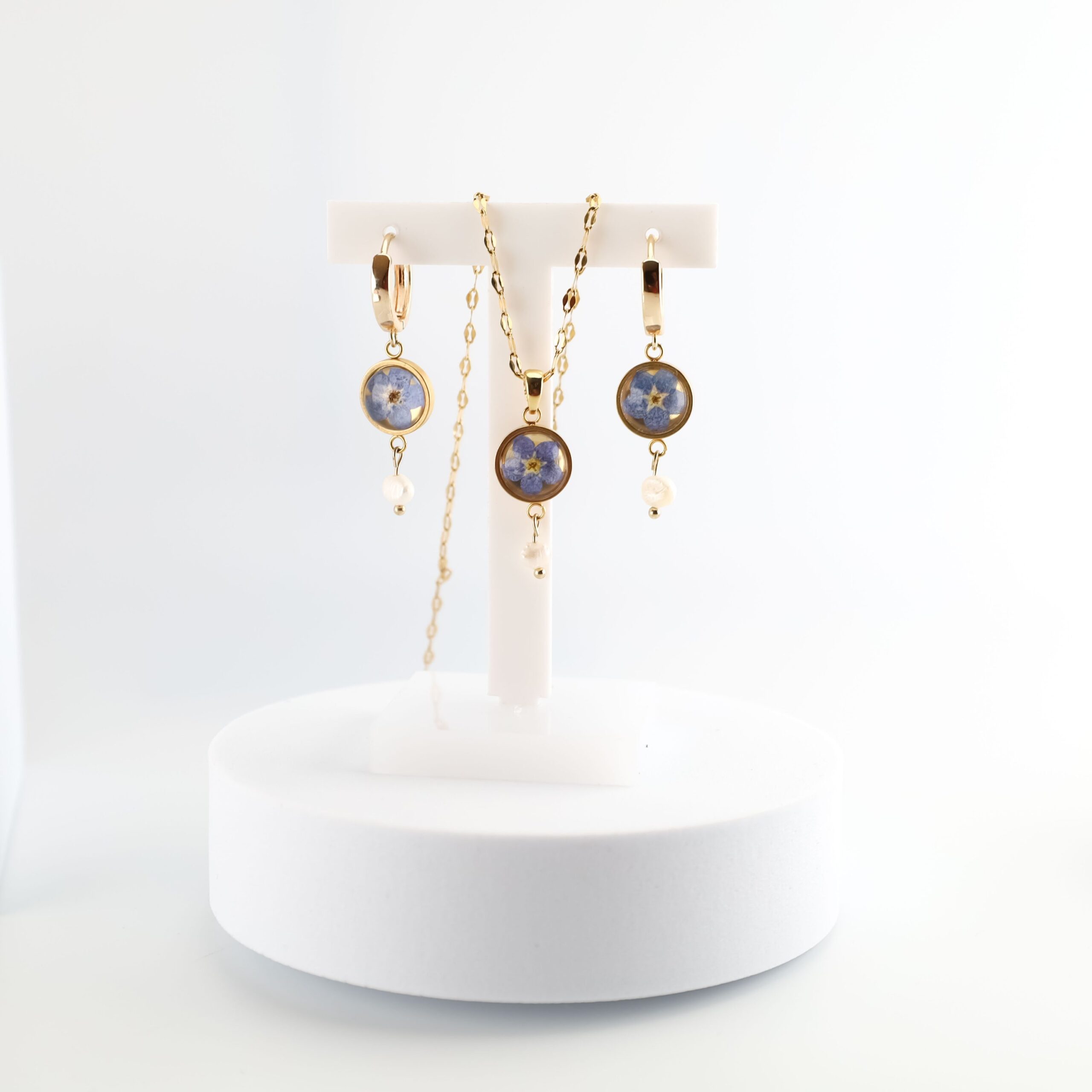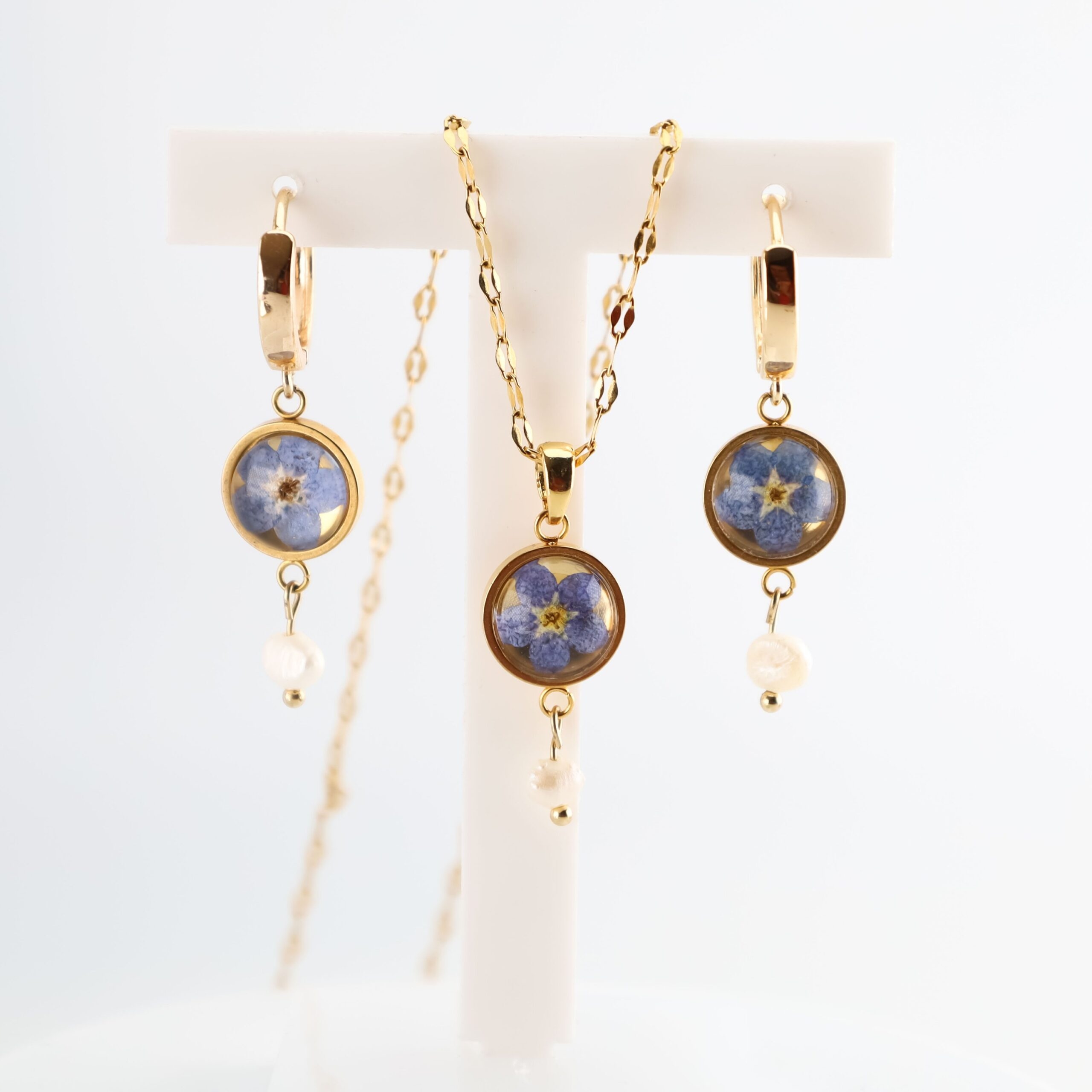 Унікальні сережки та намисто з казковими квітами забуття -Me -not, вручну, виготовленим з справжнього забуття -me -nots і з прекрасною перлиною. Унікальний унікальний, ідеально підходить для подарунка