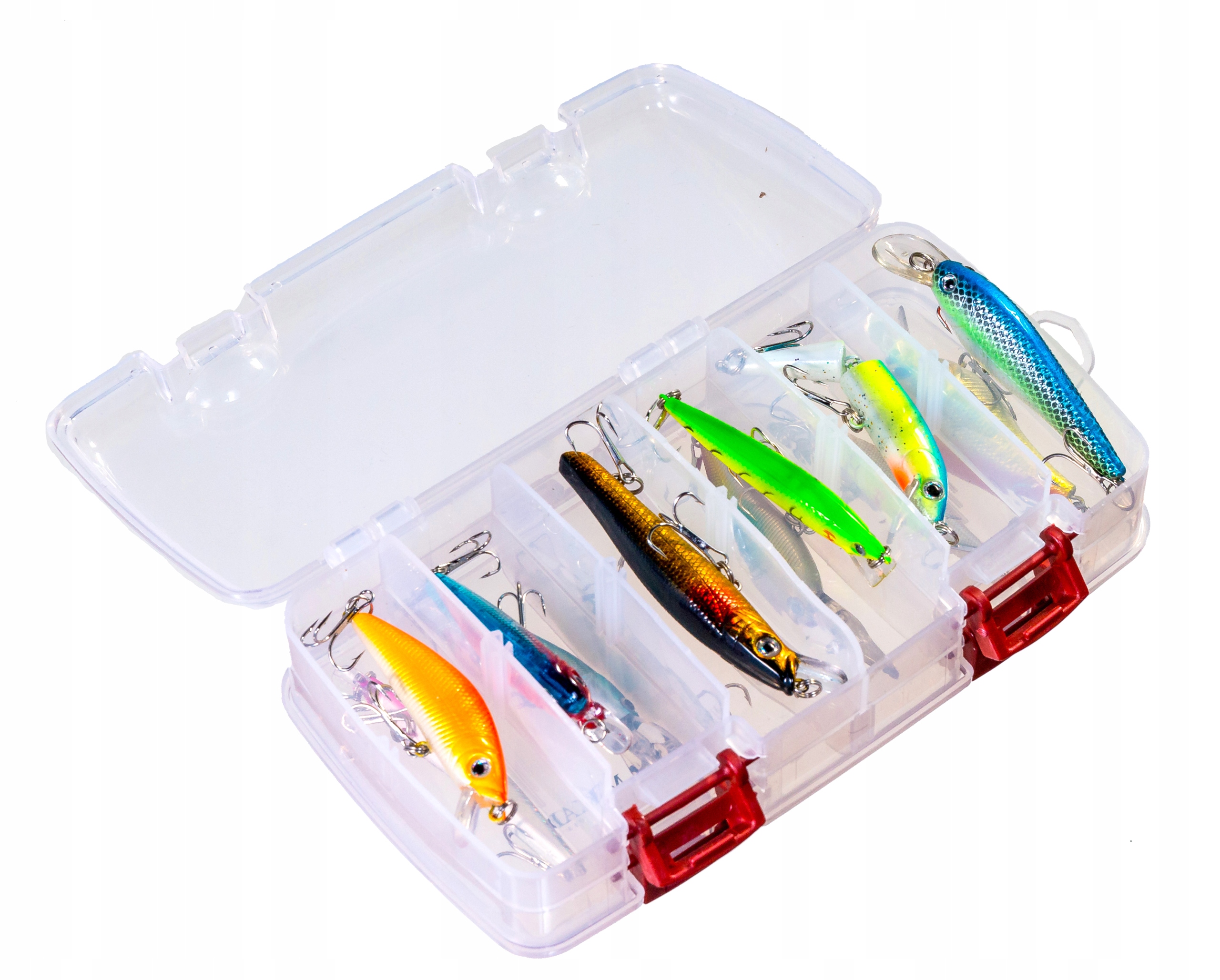 Включає 12 нерівників у розмірах від 6 до 9 см у випадковому кольорі + елегантний ящик. Виготовлені з найвищої якості, прозорого пластику, вони дозволяють спостерігати за вмістом без необхідності відкривати коробку. Розроблені таким чином, щоб вони помістилися в кишеню рибальського жилета.