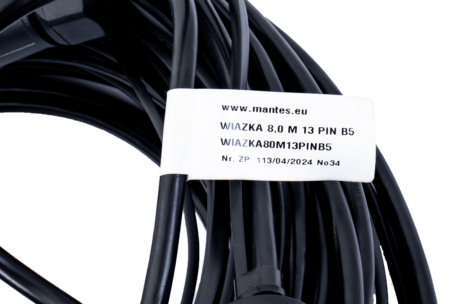 8 м кабель причепів з 13-контактною пробкою та 5-контактним баджонтом від Mantes. Висока якість виготовлення та ретельний контроль якості кабелю були підтверджені індивідуальним випробуванням кожного з елементів установки.