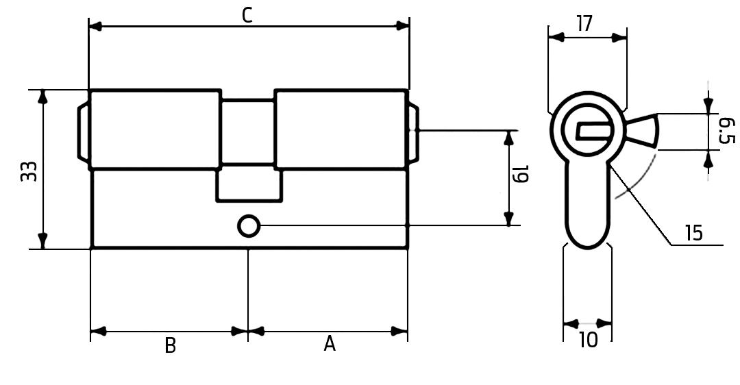 Довжина вставки C складається з двох розмірів - A і B, які вимірюються до осі (центру) торця замка, встановленого в двері. Якщо замок монтується по центру, то розмір A дорівнюватиме розміру B, а т.зв. симетрична вставка. Однак, якщо розмір A не дорівнює розміру B, слід встановити в двері асиметричну вставку, в якій розміри A і B змінюються кожні 5 мм. з кожного боку.