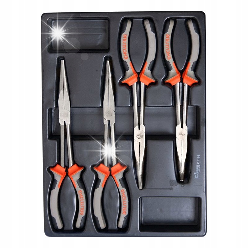 Набір із 4 подовжених плоскогубців, розміщених у вкладиші для візка для майстерні типу B.