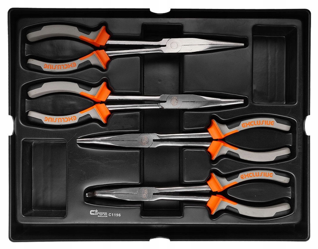 Набір включає прямі плоскогубці та плоскогубці, зігнуті під трьома різними кутами, усі кліщі мають довжину 280 мм.