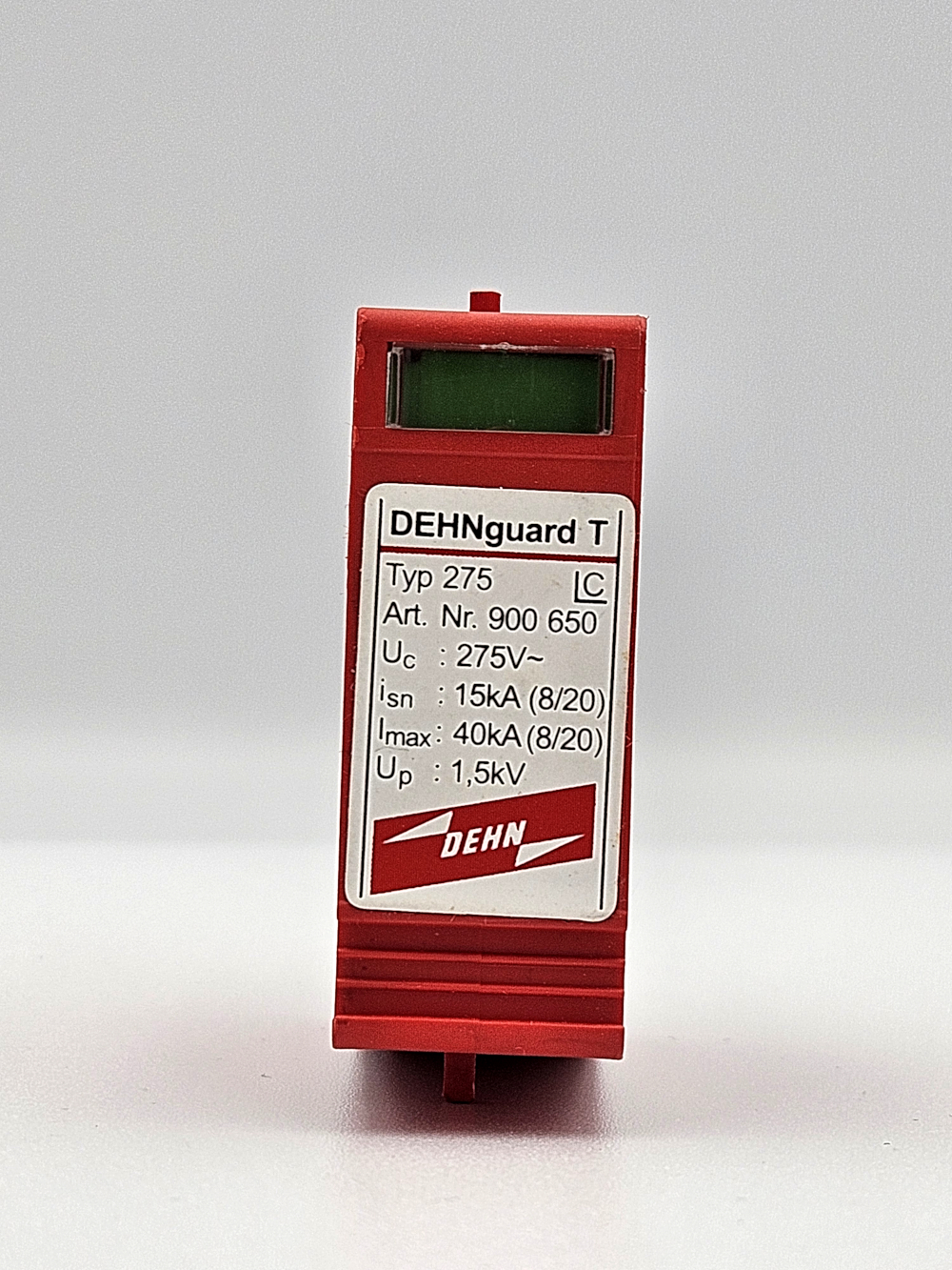 Вставка розрядника перенапруги DEHNguard — це елемент, призначений для захисту електроустановок від впливу атмосферних і комутаційних перенапруг. Код моделі 900 650 працює в системах з постійною напругою до 275 В і є запасною частиною в системі низьковольтного блискавкозахисту.