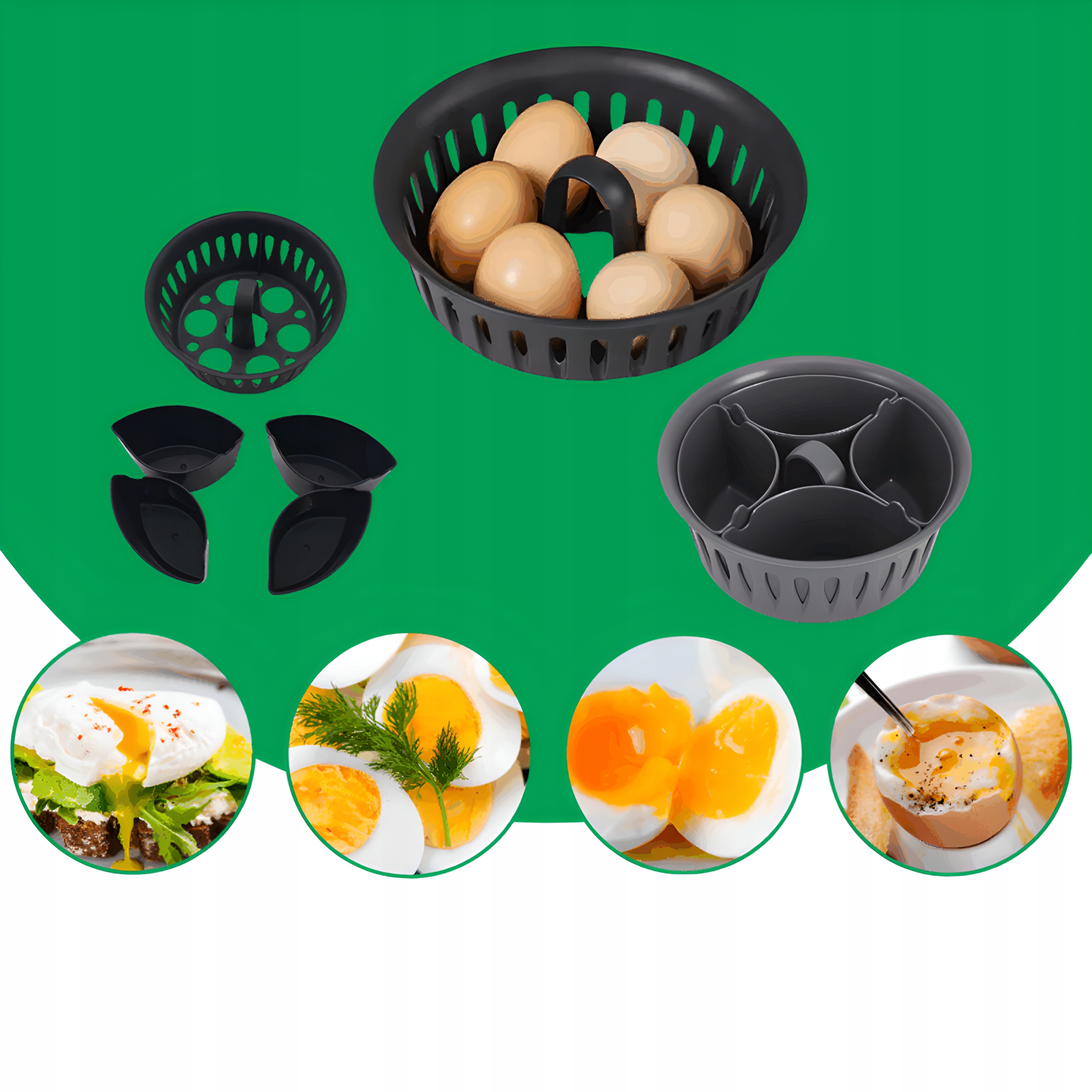 У набір входить кошик для яєць і 4 форми для приготування ідеальних яєць або яєць-пашот.