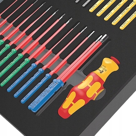 - Змінні штифти VDE (довжина 157 мм) в кількості 14 штукз практичним функція скручування, захист від скочування інструменту з робочого місця та система пошуку інструменту Take it easy: із кольоровим кодуванням відповідно до профілю та лазерним маркуванням розміру, зменшеним діаметром хвостовика та вбудованою захисною ізоляцією (iS)