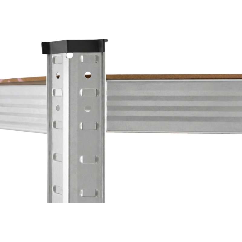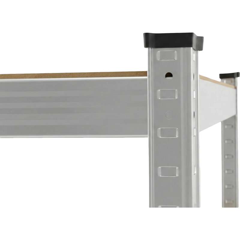 Стелаж складський з вбудованою стільницею, розміри 180×100 см, глибина полиці 30 см, верх 60 см. 5 регульованих МДФ полиць вантажопідйомністю 175 кг кожна. Конструкція оцинкована, стійка до корозії. Монтаж без гвинтів, вставний. Поєднання місця для роботи та зберігання в одному предметі меблів. Ідеально підходить для майстерень, гаражів і пакувальних станцій.