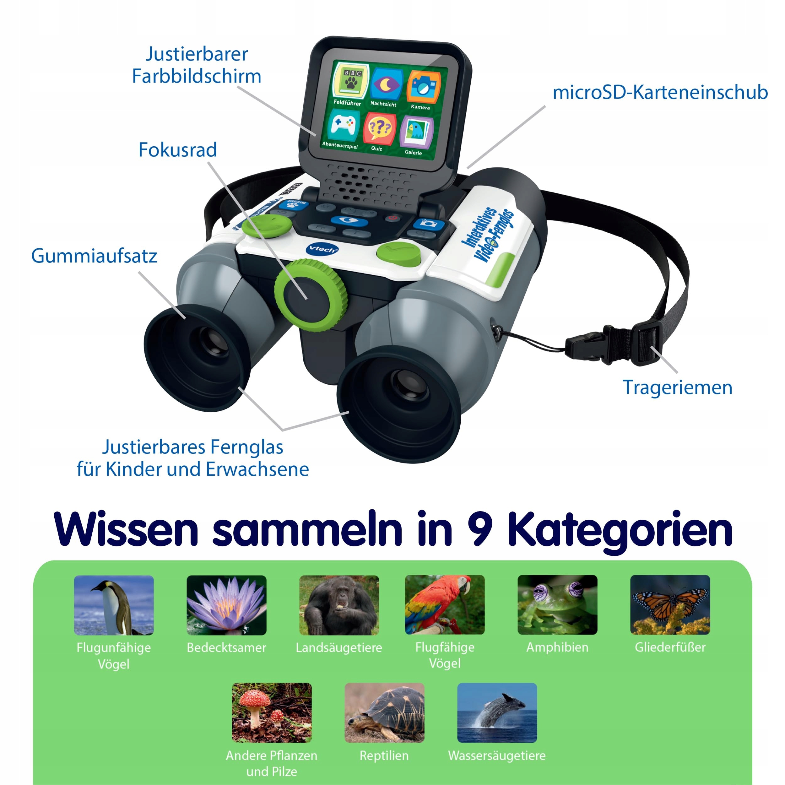 - маркер: інтерактивний бінокль із екраном і численними функціями та цікавим вмістом, понад 72 теми, 700 фактів, 360 відео та фото BBC до 9 категорій (сухопутні/морські ссавці, здатні до польоту птахи, амфібії, рептилії, членистоногі, рослини, гриби), подвійне спостереження завдяки біноклям (з регульованою відстанню між ними та м’якими гумовими ковпачками для комфортного використання) і 2,4-дюймовому кольоровому рідкокристалічному екрану, який можна легко складати та складати, щоб не заважати -> діаметр лінзи 21 мм із збільшенням до 10 разів і подвійним цифрове збільшення, функція зображення: відкриття можна зберегти на зображенні у вашій галереї, безпечний для дітей відсік для батареї, автоматичне вимкнення та регулювання гучності