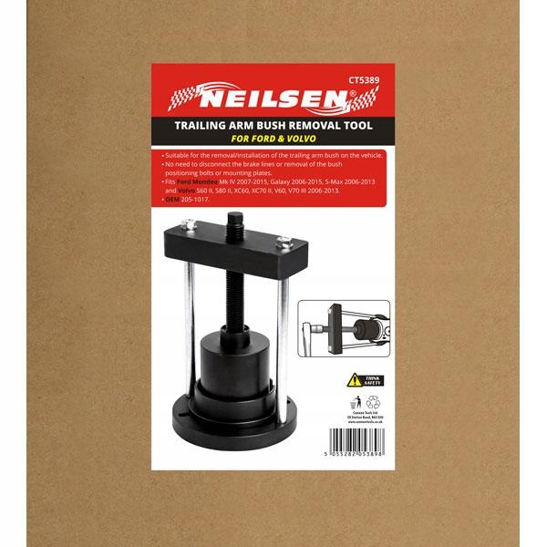 Інструмент для зняття втулок поворотного кулака для автомобілів Ford і Volvo, який використовується для демонтажу та встановлення втулок поперечних важелів у транспортному засобі без від’єднання гальмівних магістралей або видалення гвинтів позиціонування втулок чи монтажних пластин.