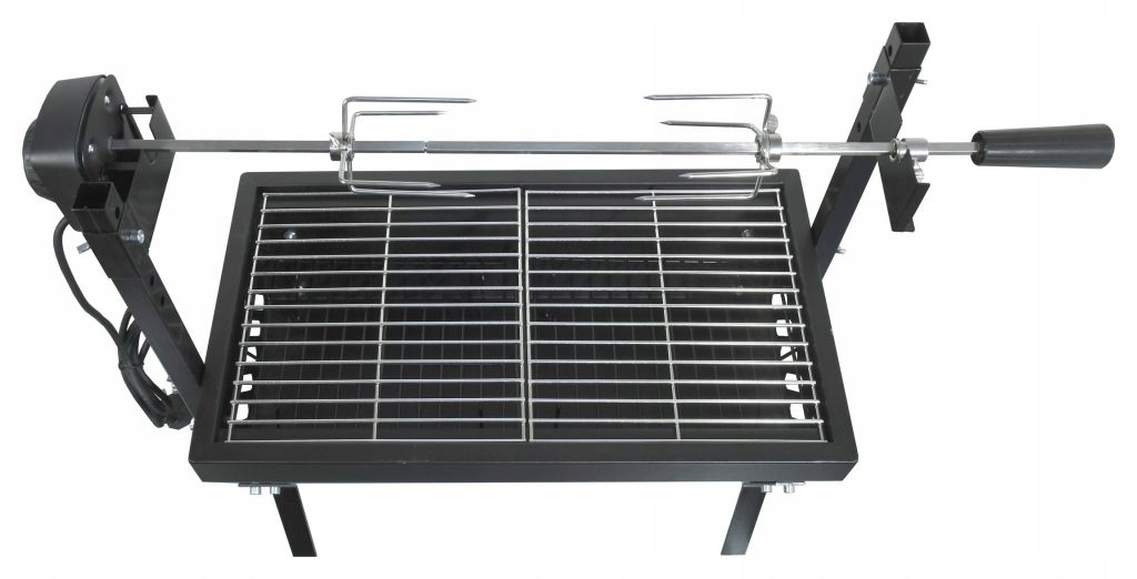 Сталева конструкція покрита міцним покриттям. Гриль оснащений повнорозмірною сталевою решіткою з двох частин для розігріву ваших ласощів. Знизу решітка оснащена масивними бічними отворами, які забезпечують надходження повітря. Металеві ніжки забезпечують високу стійкість пристрою. Гриль оснащений потужним двигуном 230В для обертання їжі, він обертається вліво і вправо, напрям змінюється при кожному включенні і виключенні двигуна. Двигун вилки можна завантажити до 8 кг їжі. При швидкості обертання (приблизно 2 обороти в хвилину) забезпечується максимально рівномірне випікання.