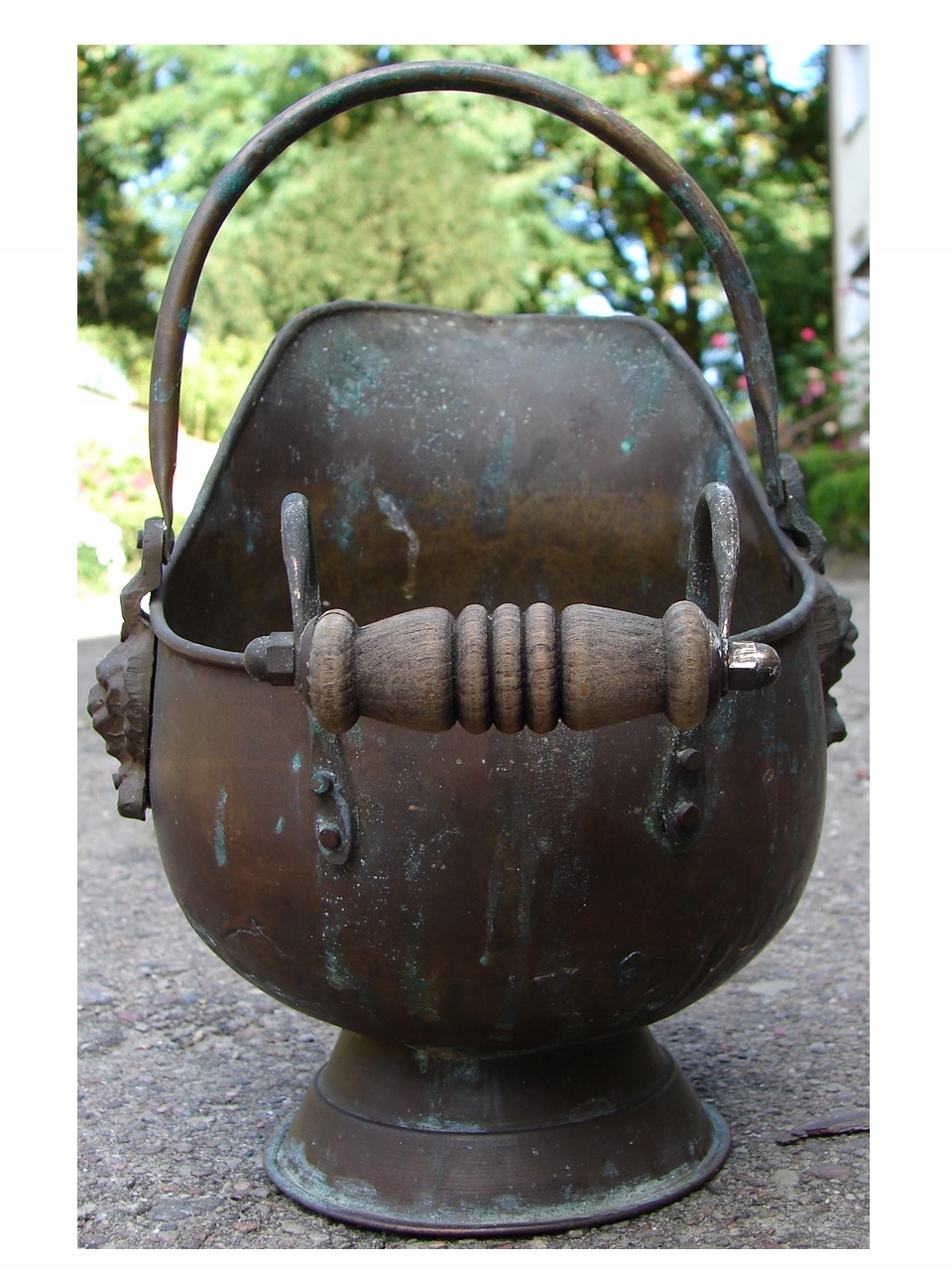 Карбоновий горщик, кришка для квітів, виготовлена в декоративній формі з латуні та міді, з дерев’яною задньою ручкою.