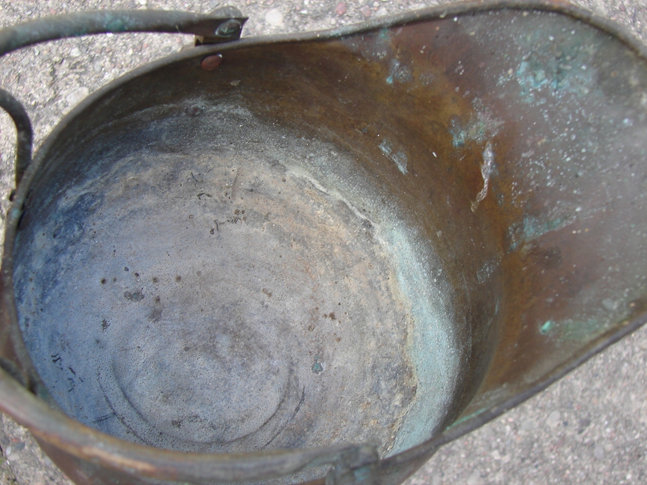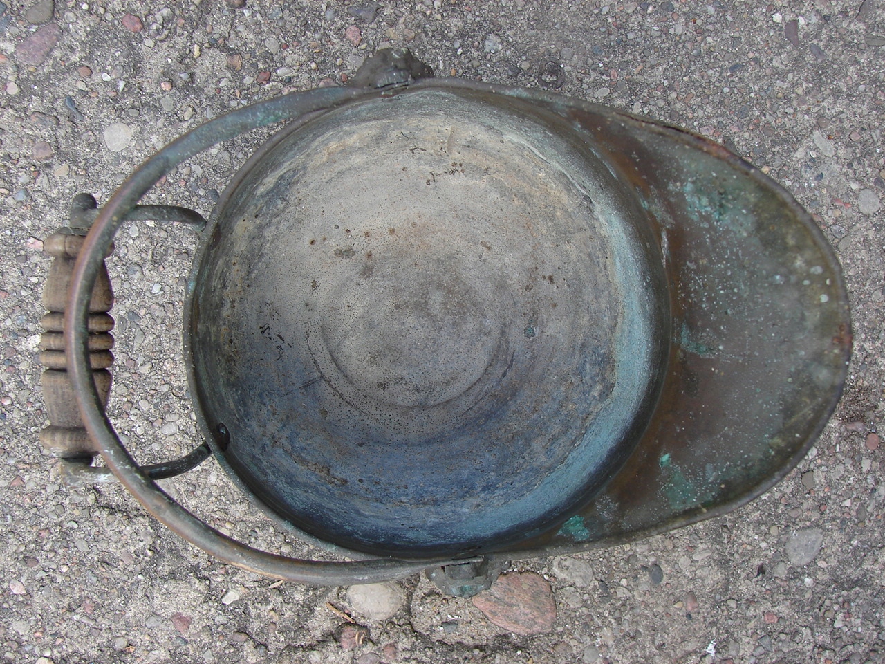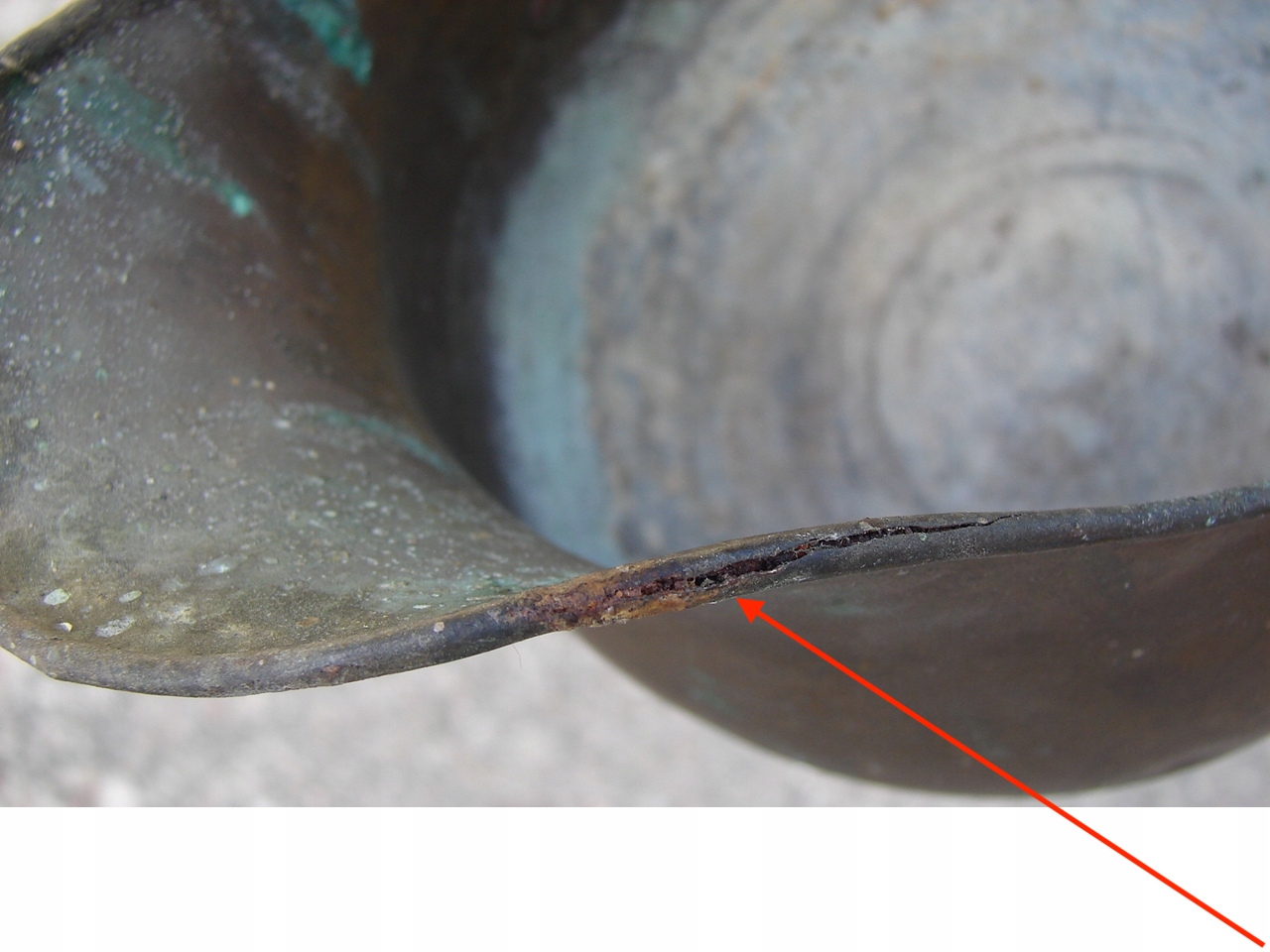 Предмет із видимими слідами патини та природного зносу та зміни кольору, типовими для старих виробів із латуні та міді. Виріб має тріщину у верхній частині краю - дефект показано червоною стрілкою при великому збільшенні.