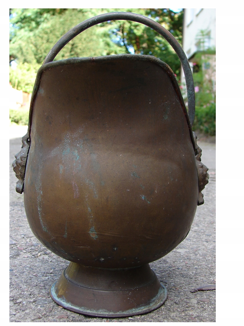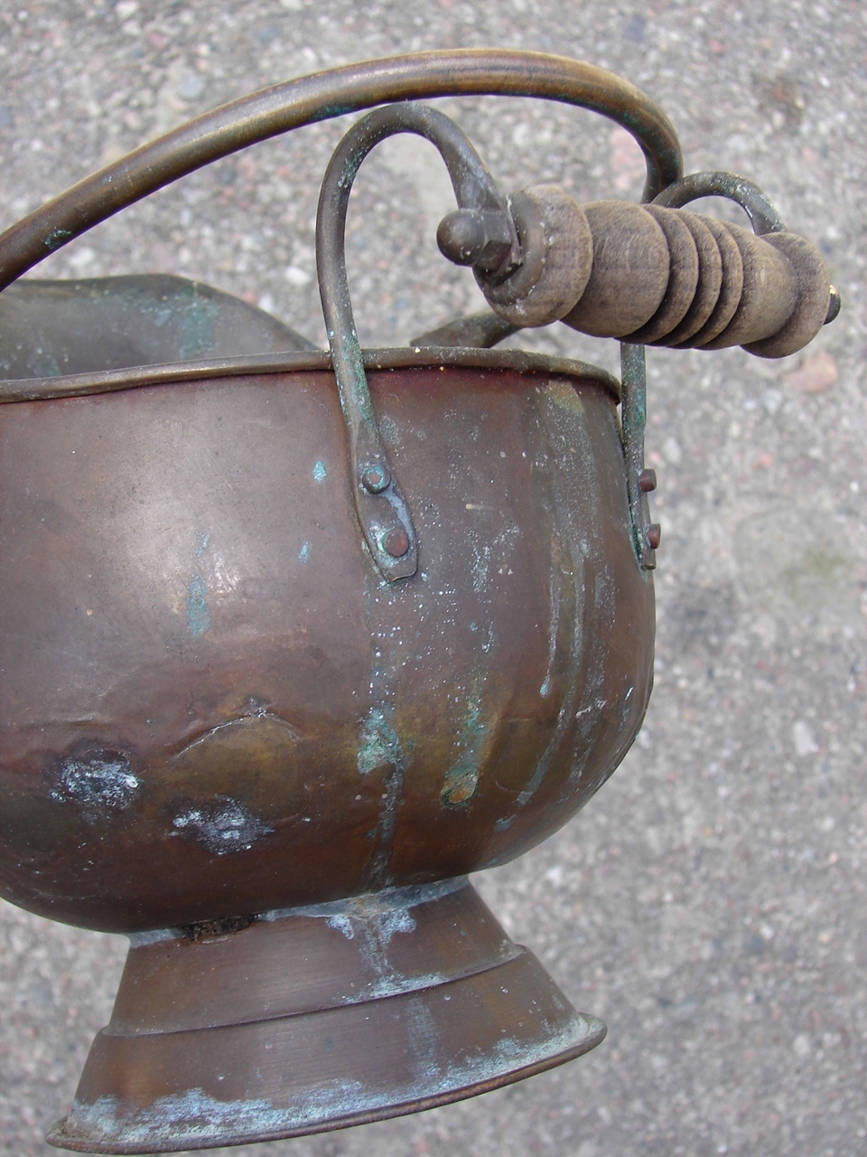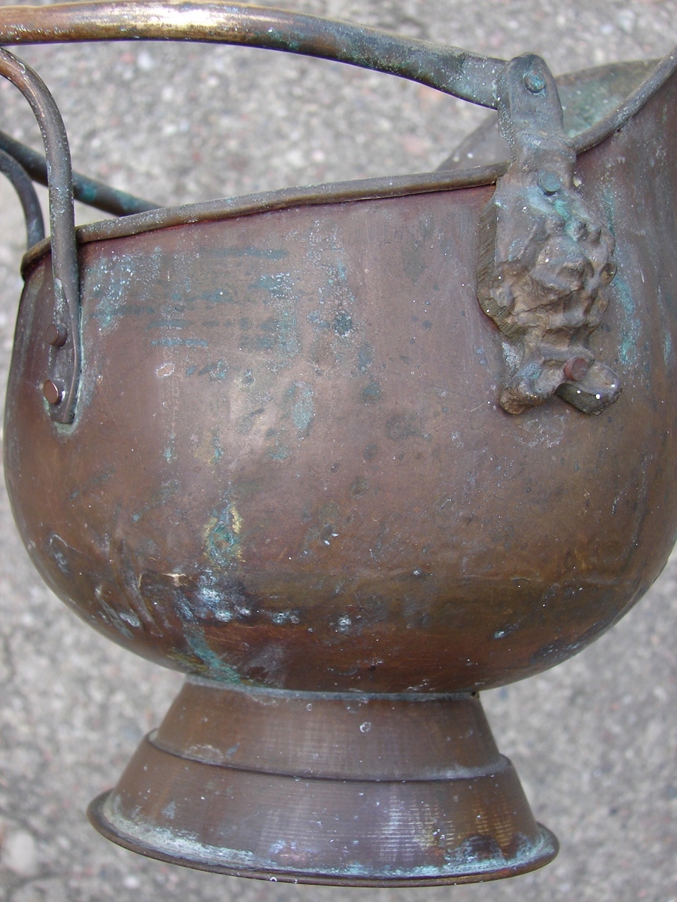 Предмет із видимими слідами патини та природного зносу та зміни кольору, типовими для старих виробів із латуні та міді. Виріб має тріщину у верхній частині краю - дефект показано червоною стрілкою при великому збільшенні.