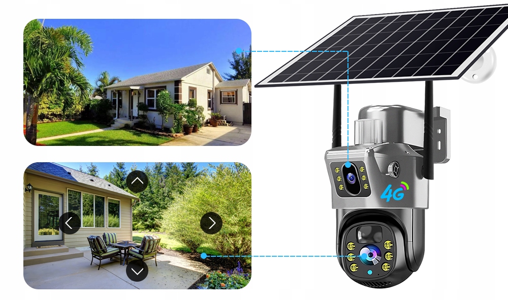 VCS09-W Solar Dual Lens SIMмає 2 лінзи, кожна з роздільною здатністю 4 Мпікс. з них нерухомий, а другий поворотний. Завдяки цьому камера здатна охоплювати дуже велику площу. Вона має всі функції, які повинна мати сучасна камера: