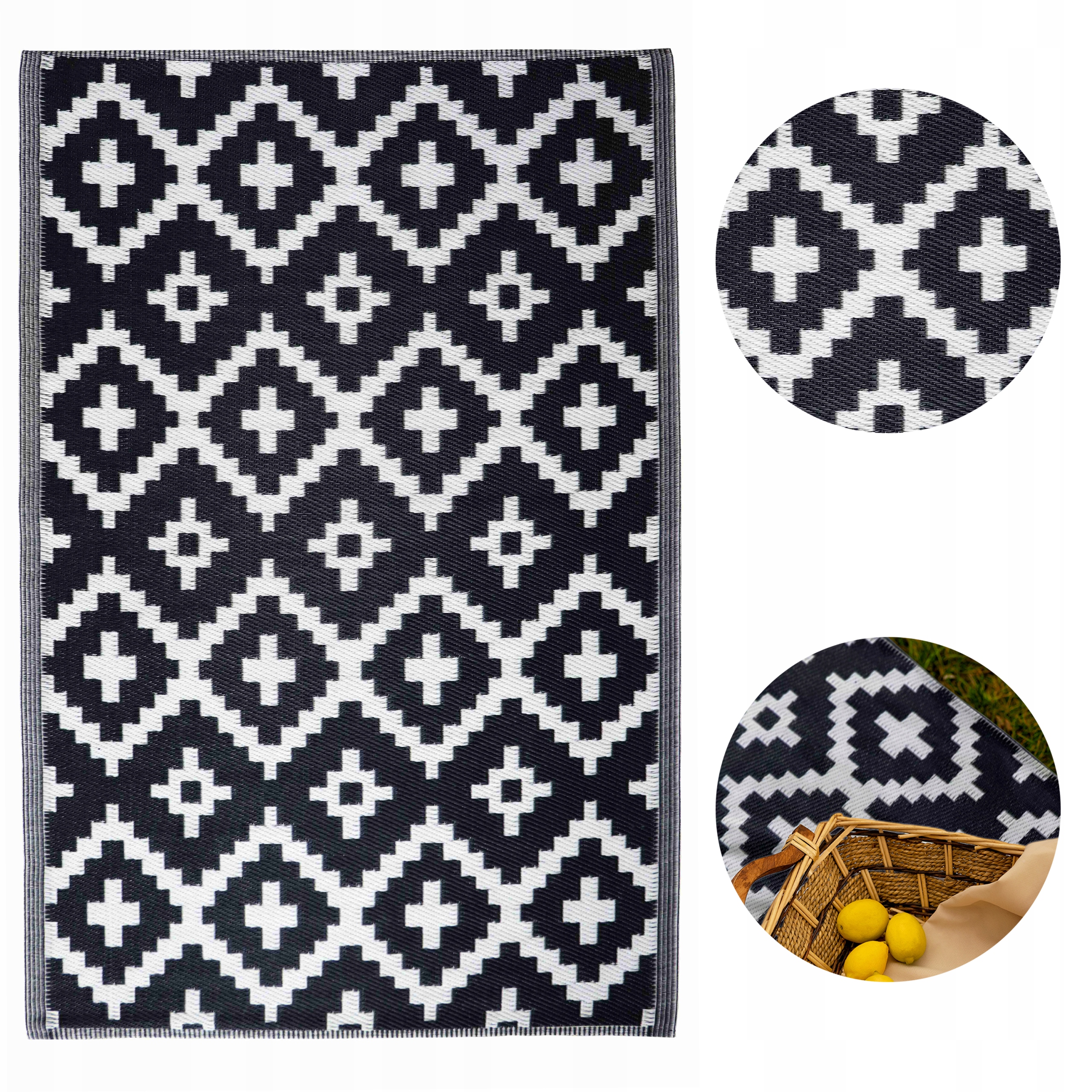 Щільний і міцний плетення забезпечує високу гнучкість і стійкість до деформації. Завдяки використанню водонепроникного та міцного матеріалу килимок має багато застосувань. Ідеально підходить як вуличний килим, домашній килим, садовий килим. Він також добре працюватиме як килимок для пікніка, пляжний килимок, кемпінговий килимок.