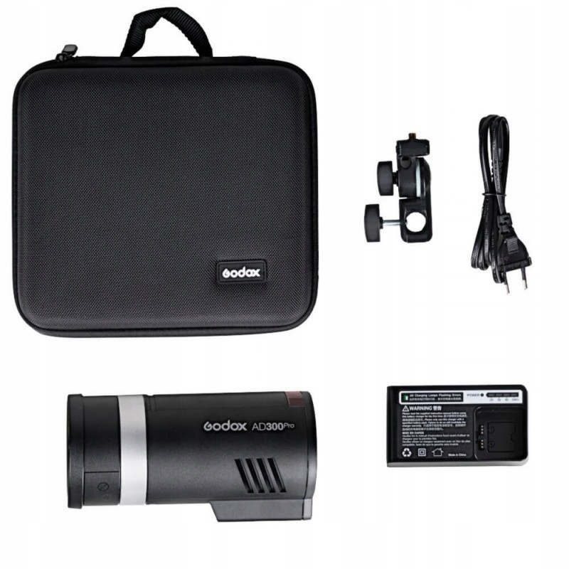 У набір входить лампа Godox AD300Pro, пальник, плафон, акумулятор, зарядний пристрій, тримач AD-E2 і сумка для транспортування.