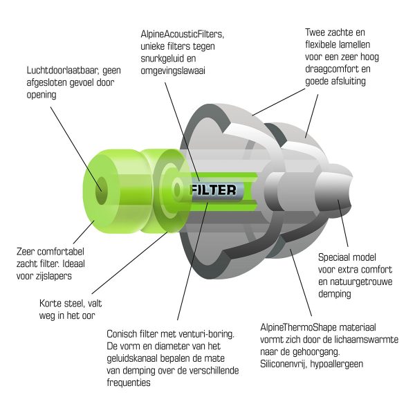 Спеціальні фільтри AlpineAcousticFilters у заглушках SleepSoft пригнічують дратівливі звуки, які заважають спати. Завдяки спеціальним фільтрам немає відчуття замкнутості, залишаються чутні будильники, дзвінки та плач дітей. М’який фільтруючий матеріал забезпечує оптимальний комфорт також для тих, хто спить на боці.