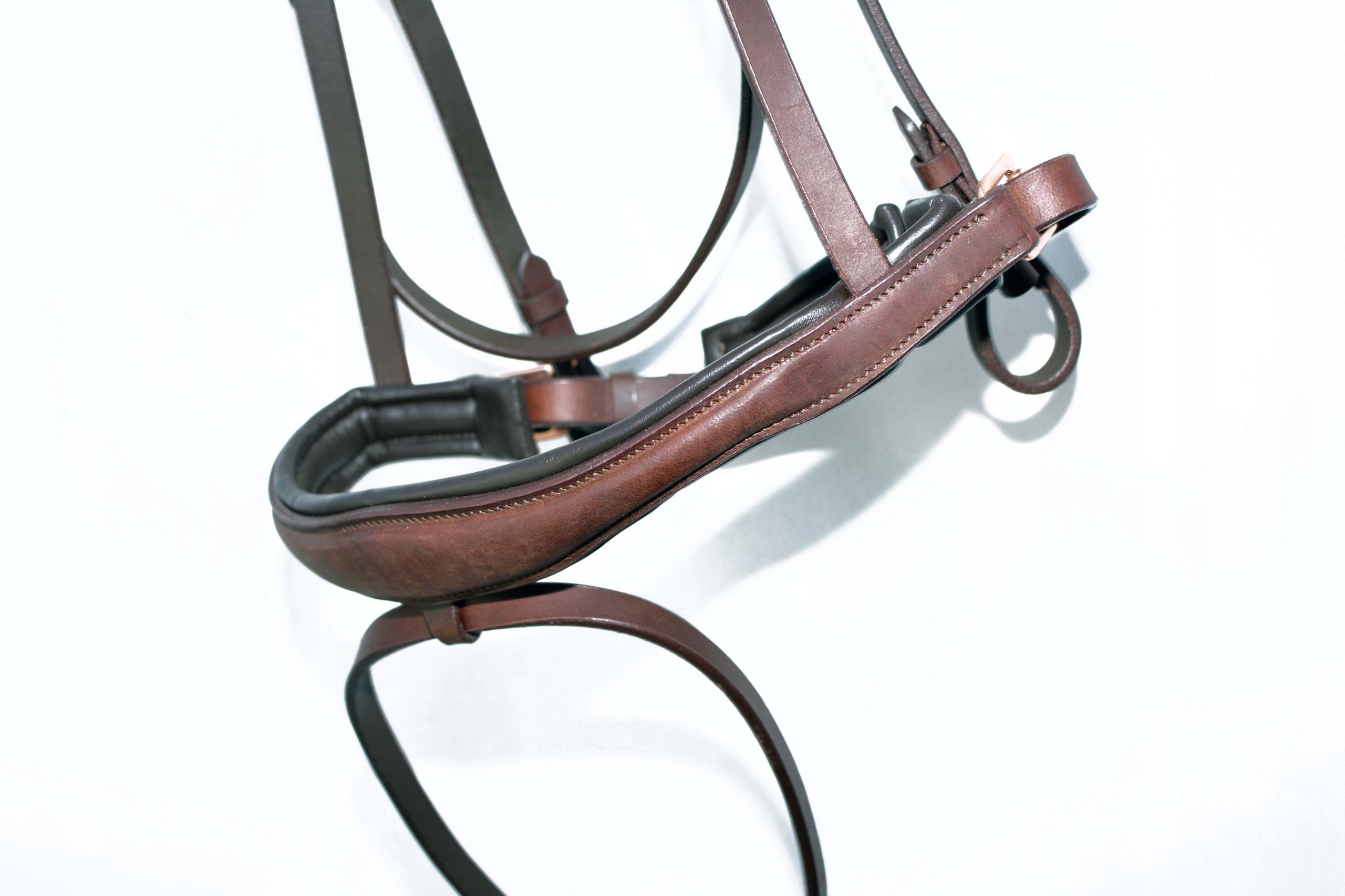 Анатомічна профільована вуздечка, FULL size Вуздечка виготовлена на заводі Saddlery в Англії. Виготовлена з натуральної шкіри найвищої якості, дуже м'яка і приємна на дотик, повністю виготовлена з англійської шкіри, потилична частина і надбрівна стрічка обтягнуті м'якою шкірою. запобігає потертості. Вуздечка застібається і регулюється за допомогою стійких пряжок, виготовлена з дуже якісної нержавіючої сталі. Не соромтеся купувати. Аукціон проводиться за вуздечку, яку видно на фото.