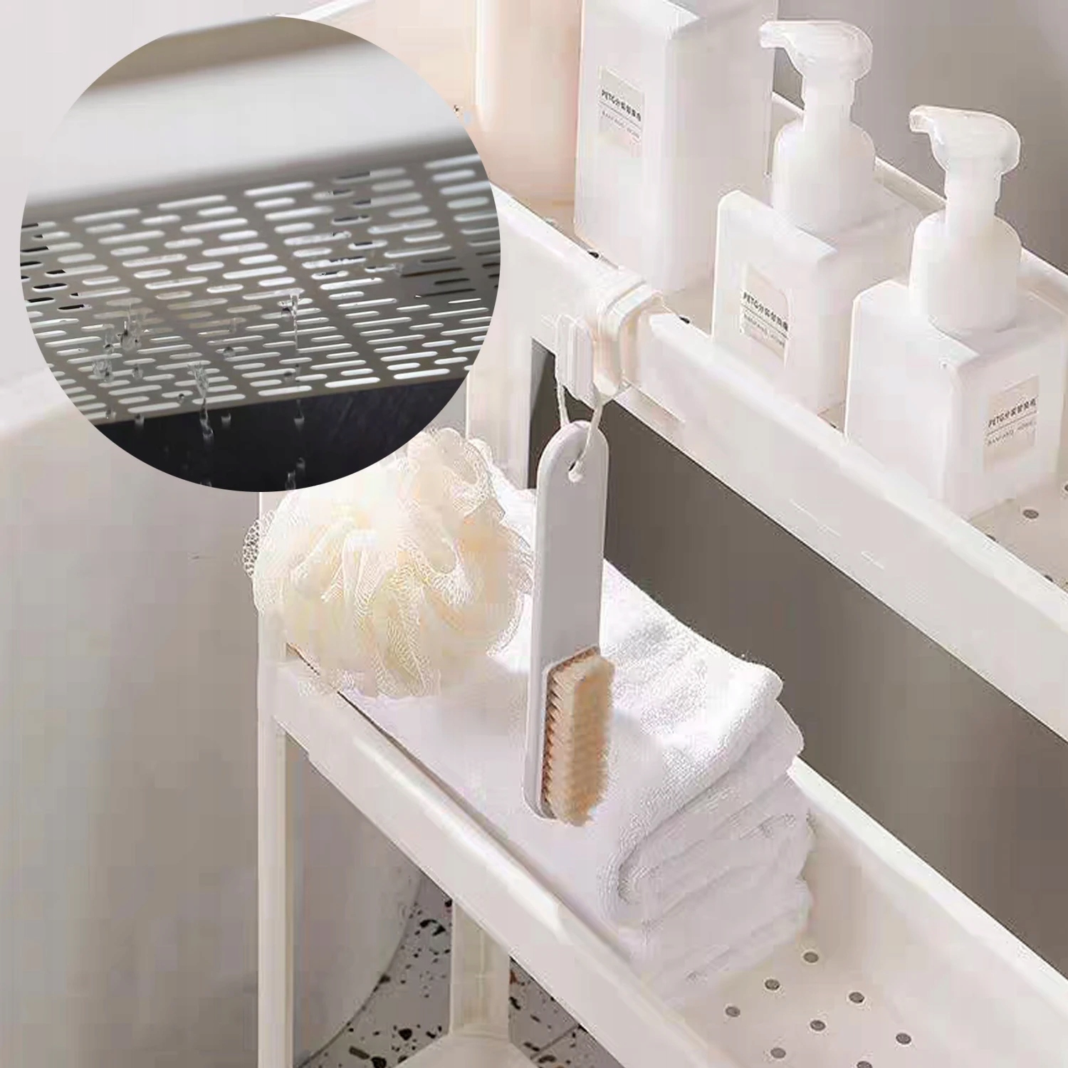 Візок для ванної кімнати обладнано колесами, що повертаються на 360°, візок для зберігання можна перемістити в будь-який куток будинку, щоб зберігати речі. Є 2 перемикачі, що замикаються, щоб більш стабільно стояти на нерівних дорогах. Ви можете гнучко використовувати його для зберігання в офісі, ванній кімнаті, пральні, кухні, у вузьких місцях тощо.