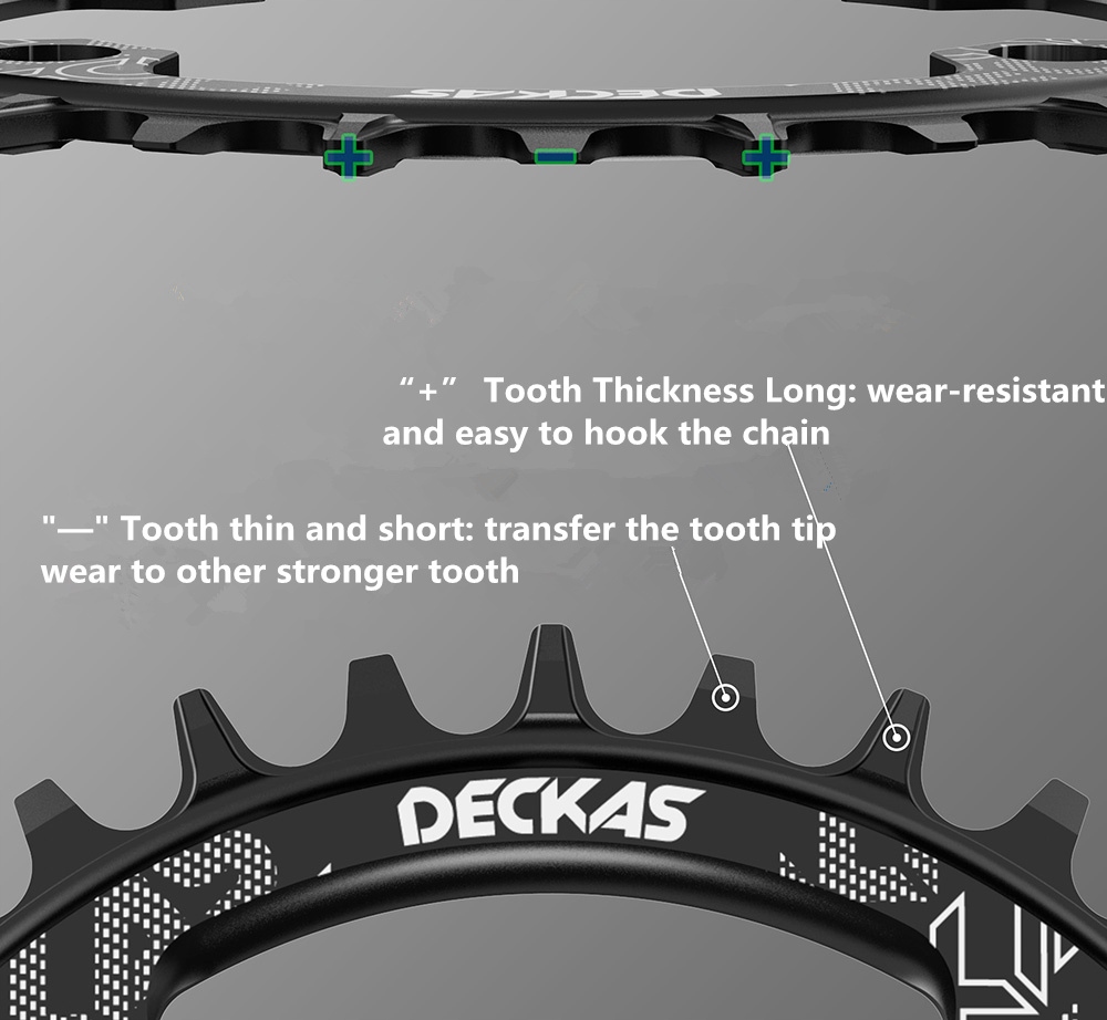 Вузька широка зірочка DECKAS на 32 зуба для приводів на 7, 8, 9, 10, 11 і 12 швидкостей. Спеціальний вузький широкий профіль зубів був розроблений і протестований, щоб усунути необхідність використання натягувача ланцюга та гарантувати утримання ланцюга в екстремальних ситуаціях. Зірочка виготовлена з високоякісного алюмінію, підходить до кривошипів з асиметричним інтервалом між отворами BCD 96 мм