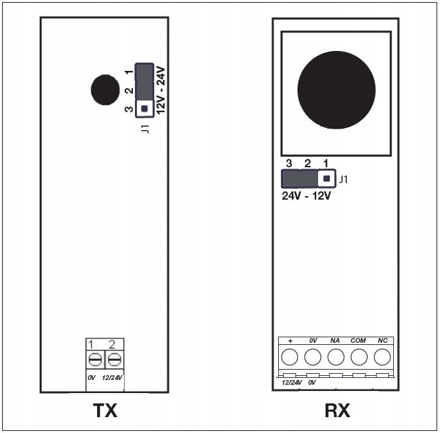 Напруга живлення 12 В або 24 В обирається перемичкою в передавальній (TX) і приймальній (RX) головках.