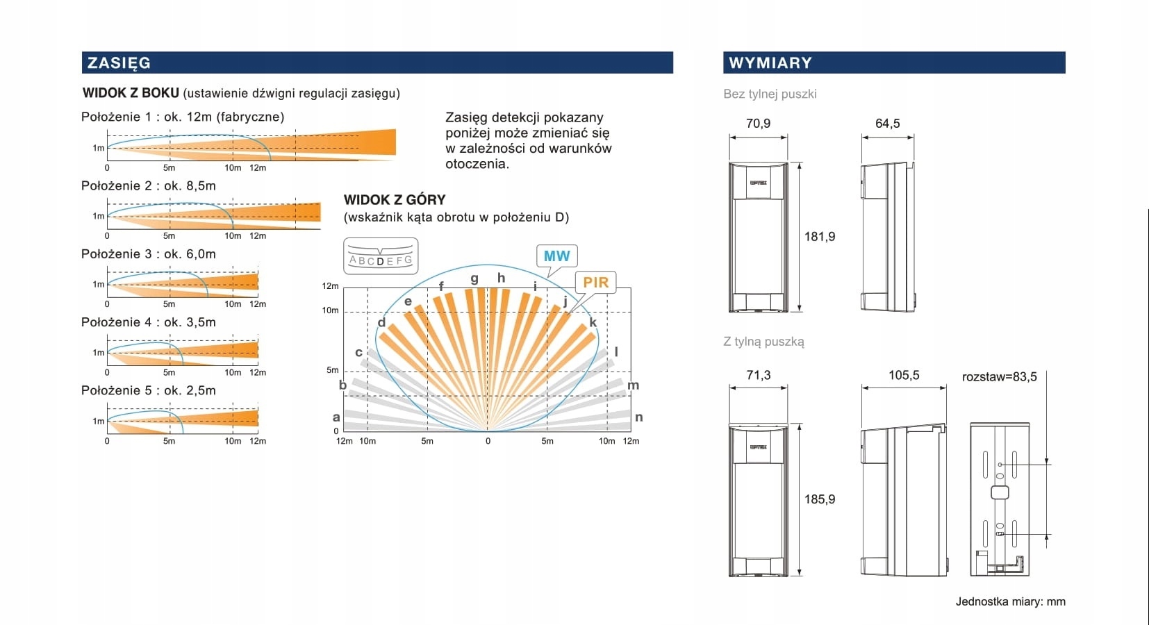 - Регулювання діапазону PIR: 12 -2,5 м (5 налаштувань)