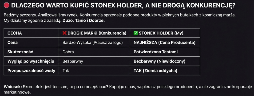 Представляємо STONEX HOLDER. Це сучасний полімерний сполучний, який діє так само ефективно, як і «фірмові» препарати вартістю сотні злотих, але коштує незначну частину їхньої ціни.