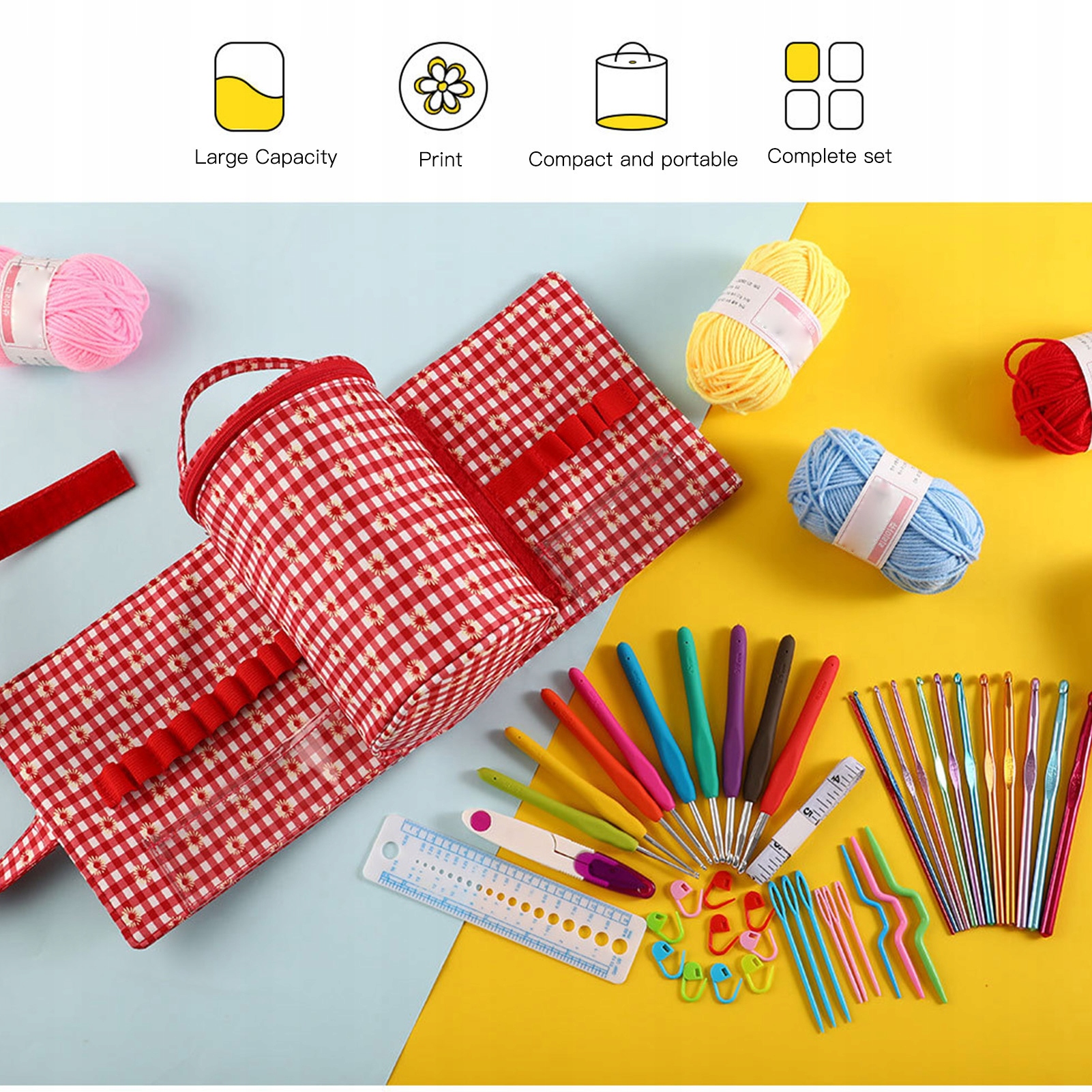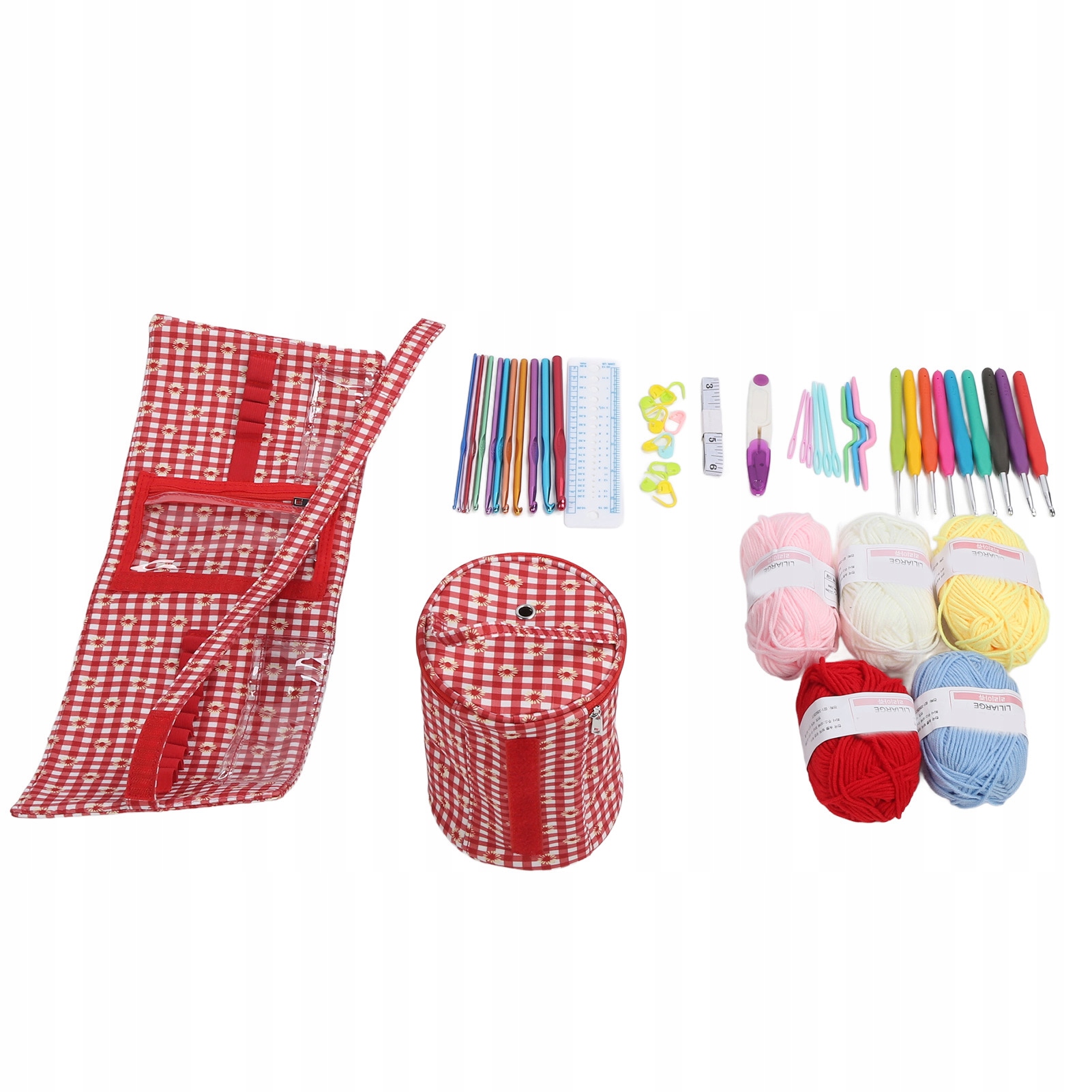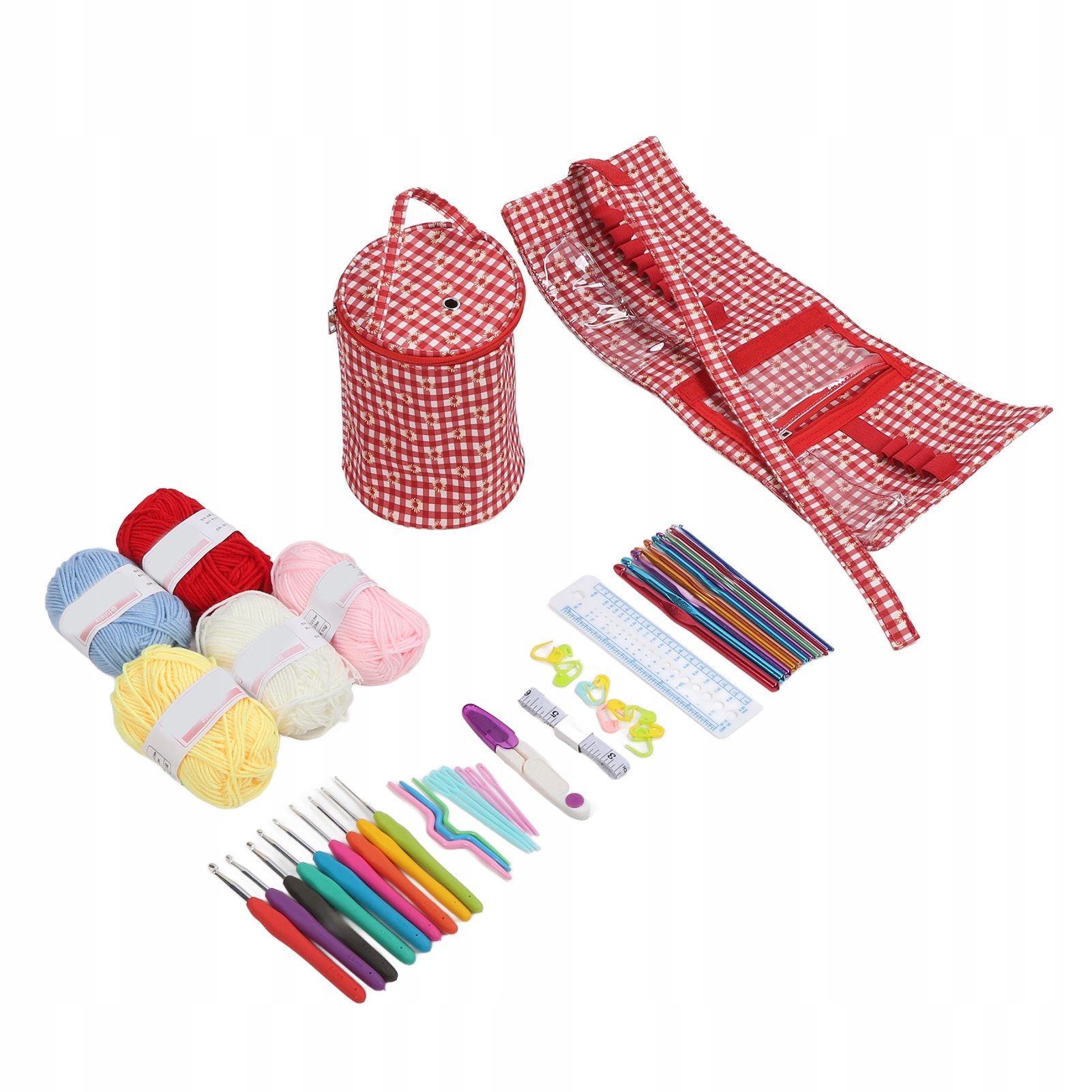 1. Набір включає: ви отримаєте 12 алюмінієвих гачком, 9 гачком A, 6 пластикових швейних голки, 5 валиків -пряжі, 10 маркерів стібків, 3 пластикові кабелі, 1 міра, 1 лінія, 1 захисні ножиці, 1 захисні ножиці, 1 контейнер для зберігання сумки.
