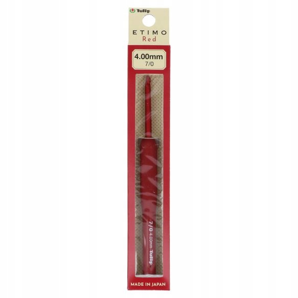 Японський високоякісний гачок для в'язання Tulip Etimo Red має гладку голівку гарної форми, яка ідеально підходить для руки. Матовий червоний гачок, не відбиває світло і виділяється при в'язанні на тлі темних кольорів.