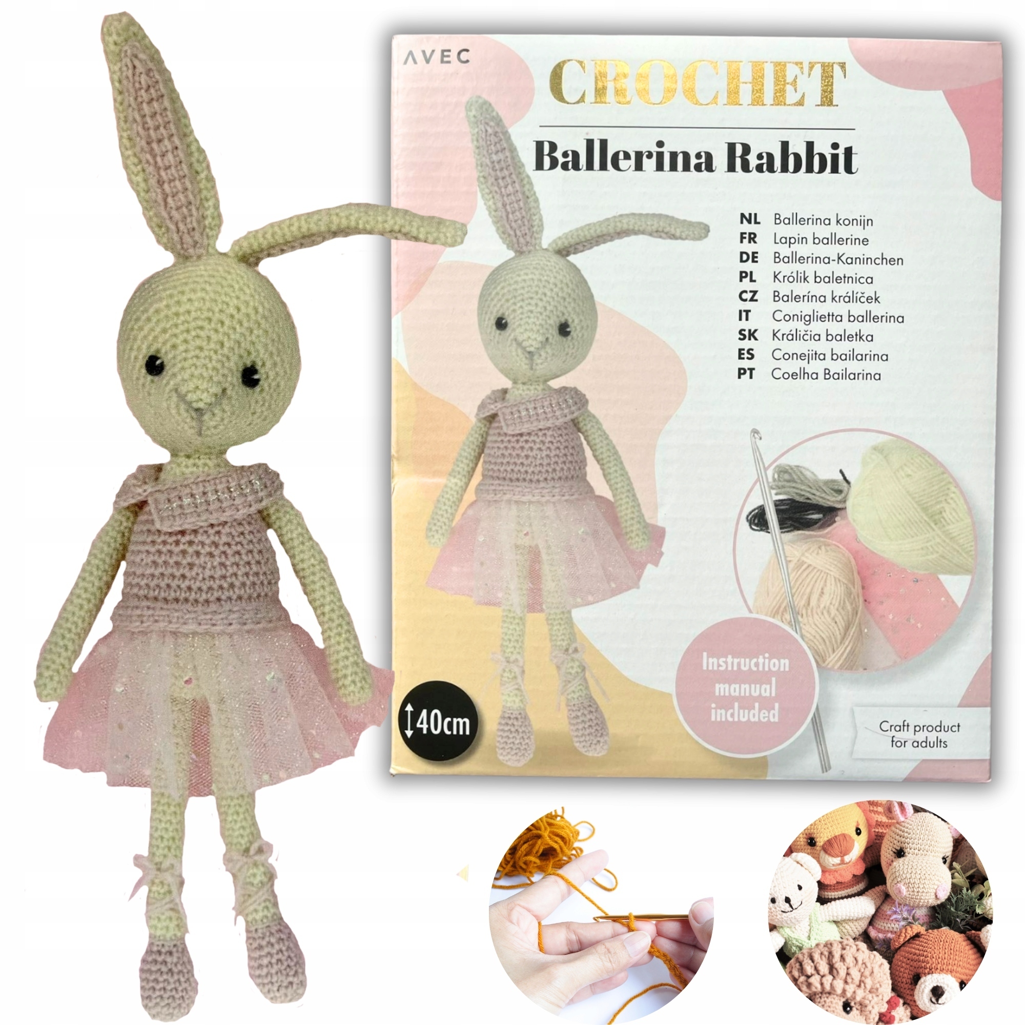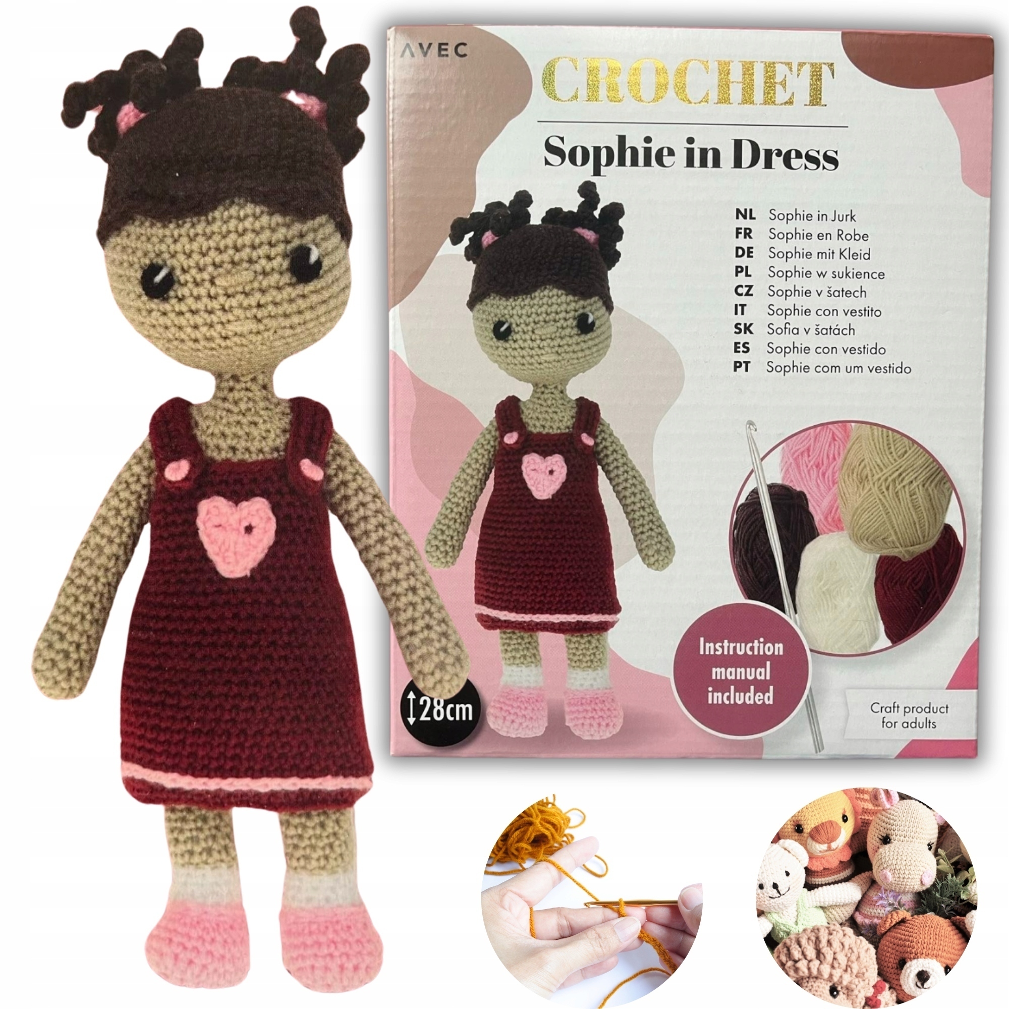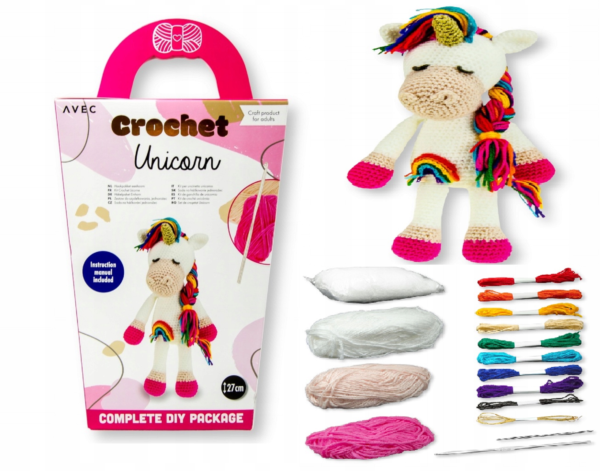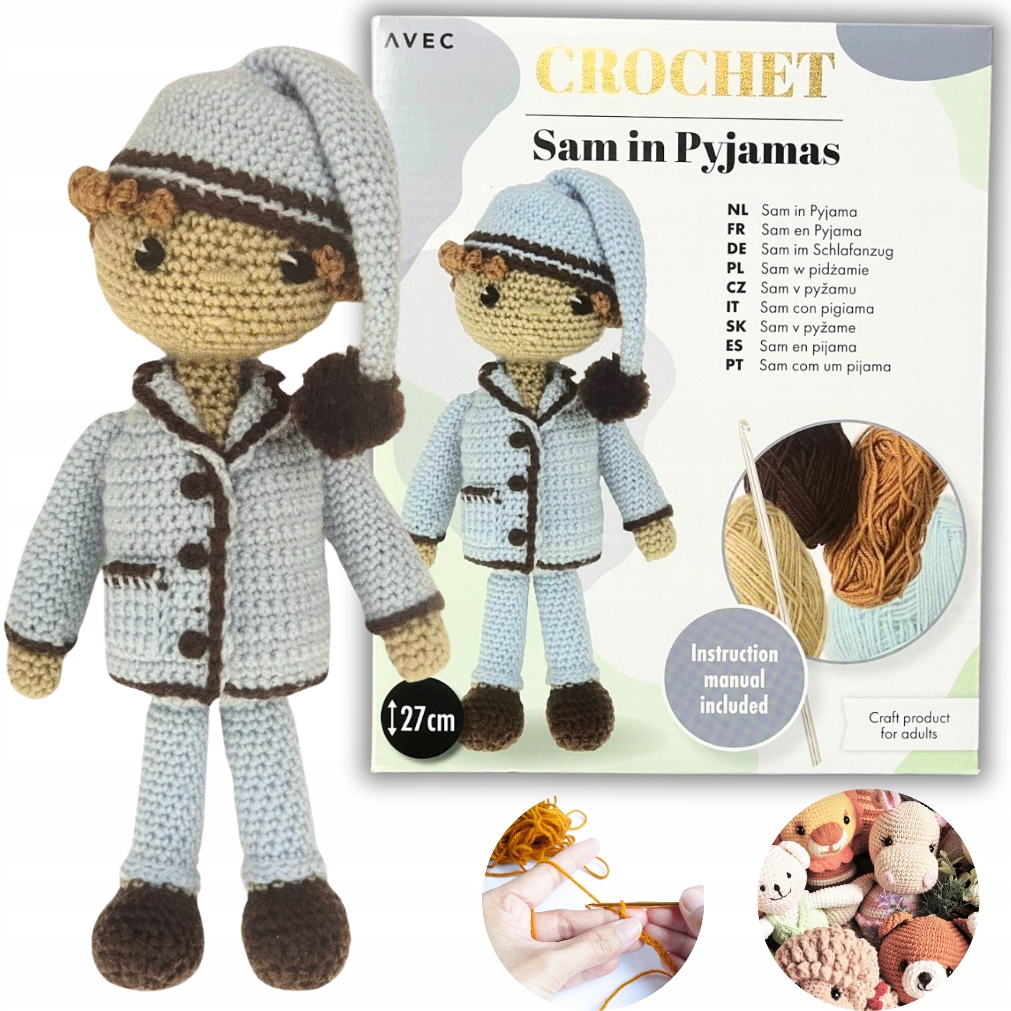Ви знайдете пряжу, гачок для в’язання, голку, наповнювач і докладні інструкції.