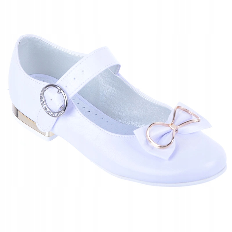 Красиве взуття для першого причастя, зручні човники/балетки. Верх виготовлений з екологічної шкіри. Взуття також має шкіряну профільовану устілку. Легкі, дуже зручні! Зроблено з увагою до деталей. Туфлі на білому невисокому каблуці з золотою вставкою. Прикрашений елегантними білими бантами з привабливою пряжкою. Вони ідеально підходять для урочистих випадків. Продукт повністю виготовлений у Польщі компанією MIKO